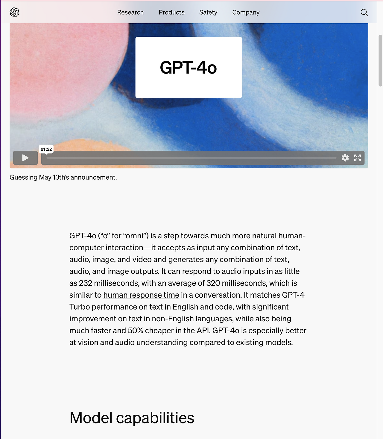 2024년 5월 13일 OpenAI 가 발표한 ChatGPT-4o 모델에 대한 뉴스를 요약해 달라고 했는데, 잘 정리를 한것 같네요.