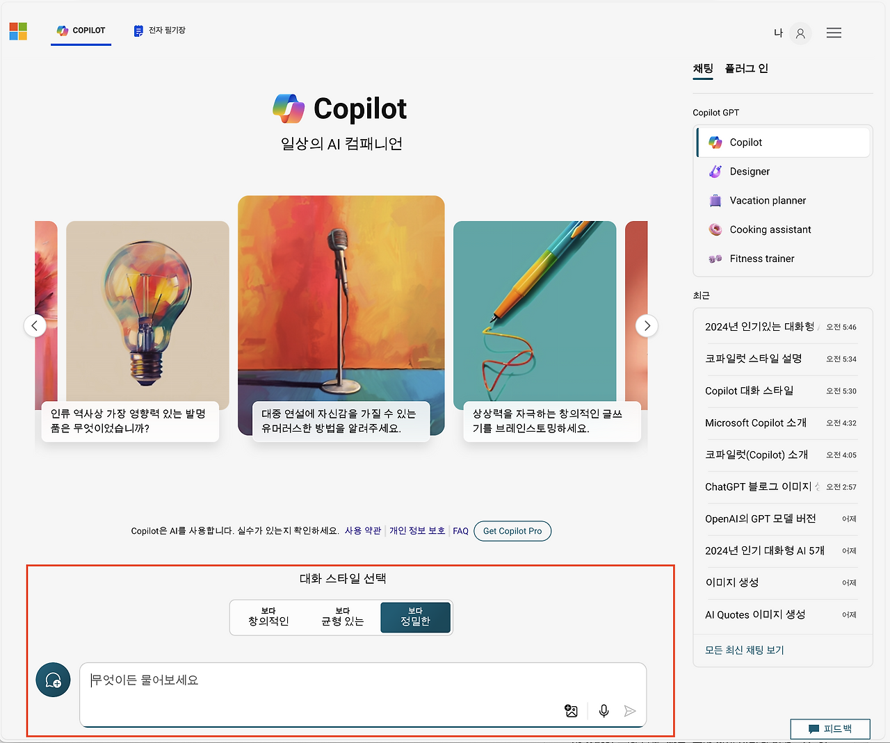 Copilot은 사용자의 요구에 따라 세 가지 대화 스타일을 제공합니다. 이러한 스타일은 코파일럿의 대화 방식을 조정하여 사용자의 요구에 가장 잘 맞는 결과를 제공합니다.