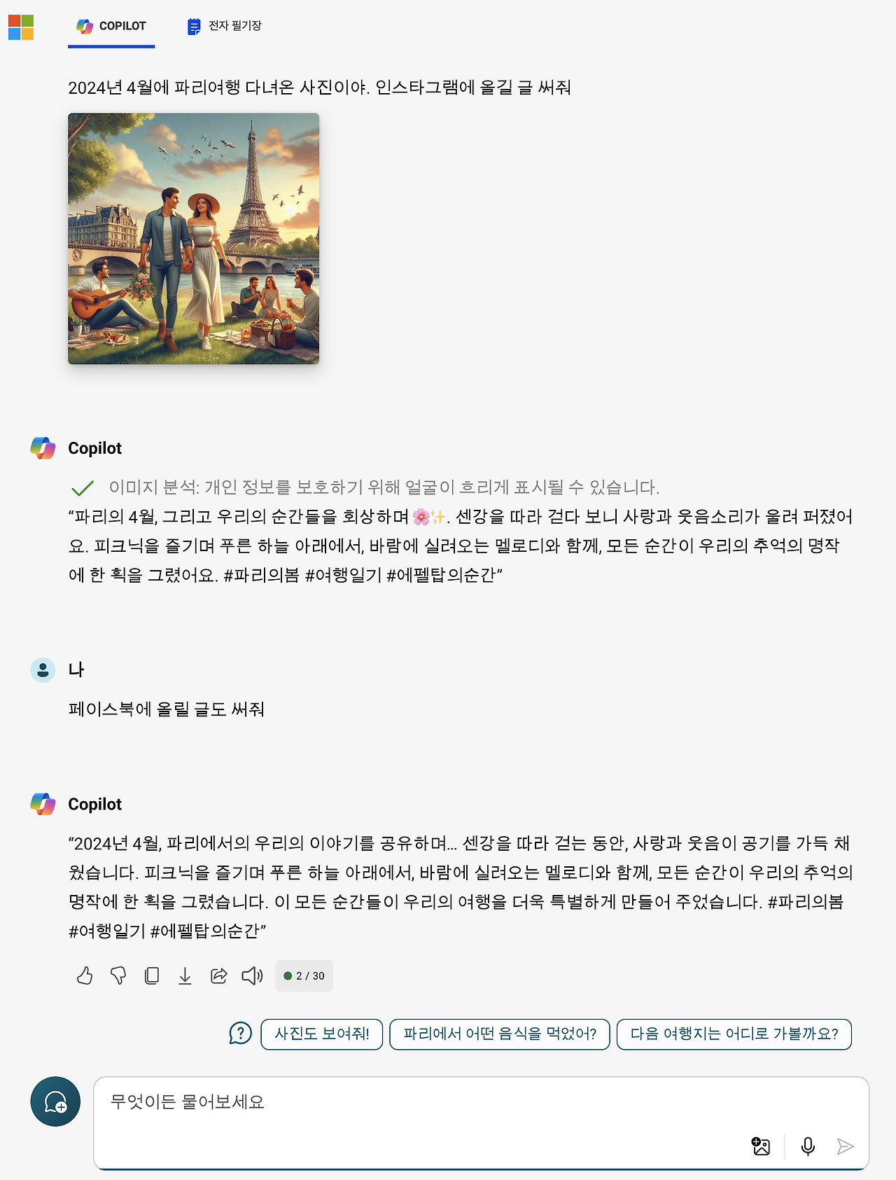 파리 여행에서 찍은 사진을 업로드 하고 인스타 그램, 페이스 북에 올릴 글을 써달라고 했는데 결과가 괜찮아 보이네요. 이미지를 묘사하고 컨텐츠를 만드는 기술이 놀랍습니다.