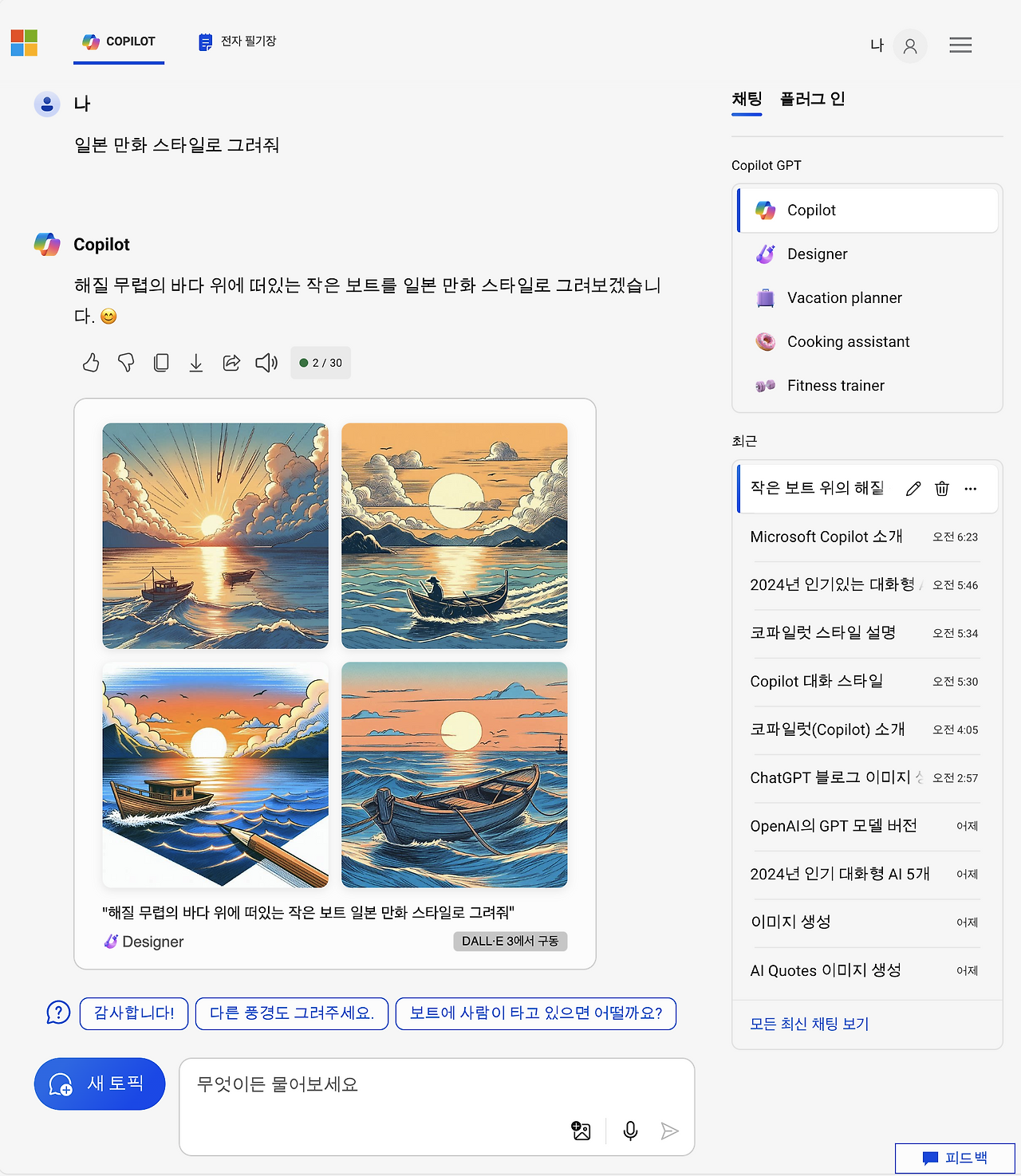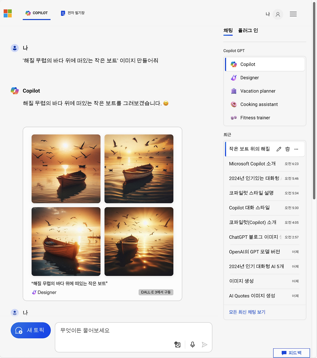 이미지 설명을 입력하고 '이미지 만들어줘'라고 하면 텍스트 설명을 기반으로 이미지를 4개 생성합니다. 이 기능은 DALL.E3 모델을 사용하여 사용자의 요구 사항에 맞는 시각적 콘텐츠를 만들어냅니다. 예를 들어, 사용자가 "해질 무렵의 바다 위에 떠있는 작은 보트"라는 설명을 제공하면, 이 설명을 이해하고 해당 설명에 가장 잘 맞는 이미지를 생성합니다. 생성된 이미지를 다운로드하거나 공유할 수도 있습니다.