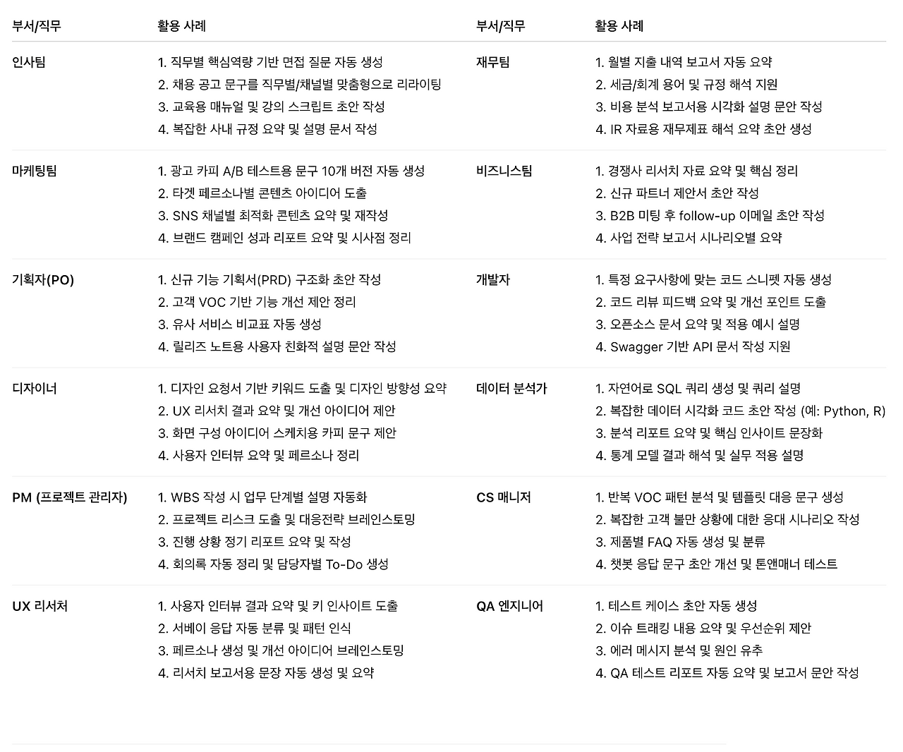 GPTs 기능을 활용하면 반복 업무를 자동화하거나, 보고서 초안 작성, 아이디어 도출, 데이터 요약 등 실질적인 업무 시간을 획기적으로 단축할 수 있습니다. 아래는 인사, 재무, 마케팅 등 다양한 부서/직무별로 GPTs를 어떻게 실무에 활용할 수 있는지 구체적인 사례를 정리한 표입니다. 우리 팀에 어떤 방식으로 적용할 수 있을지 아이디어를 얻어보세요.