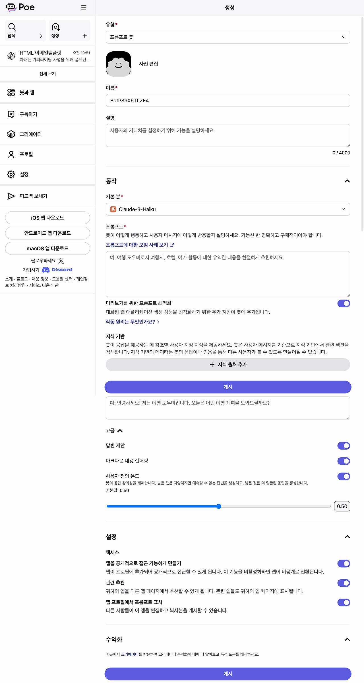 모든 설정을 완료한 후, 하단의 [게시] 버튼을 클릭하면 챗봇이 Poe 플랫폼에 등록됩니다.