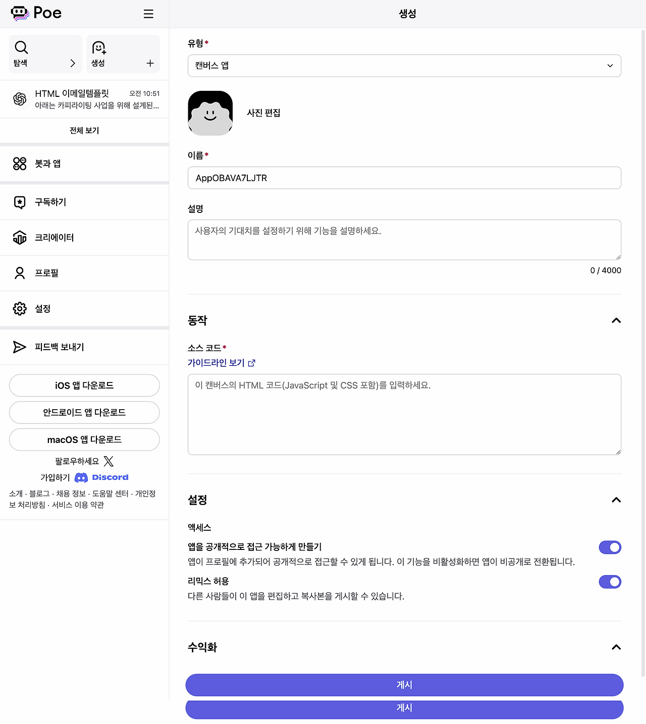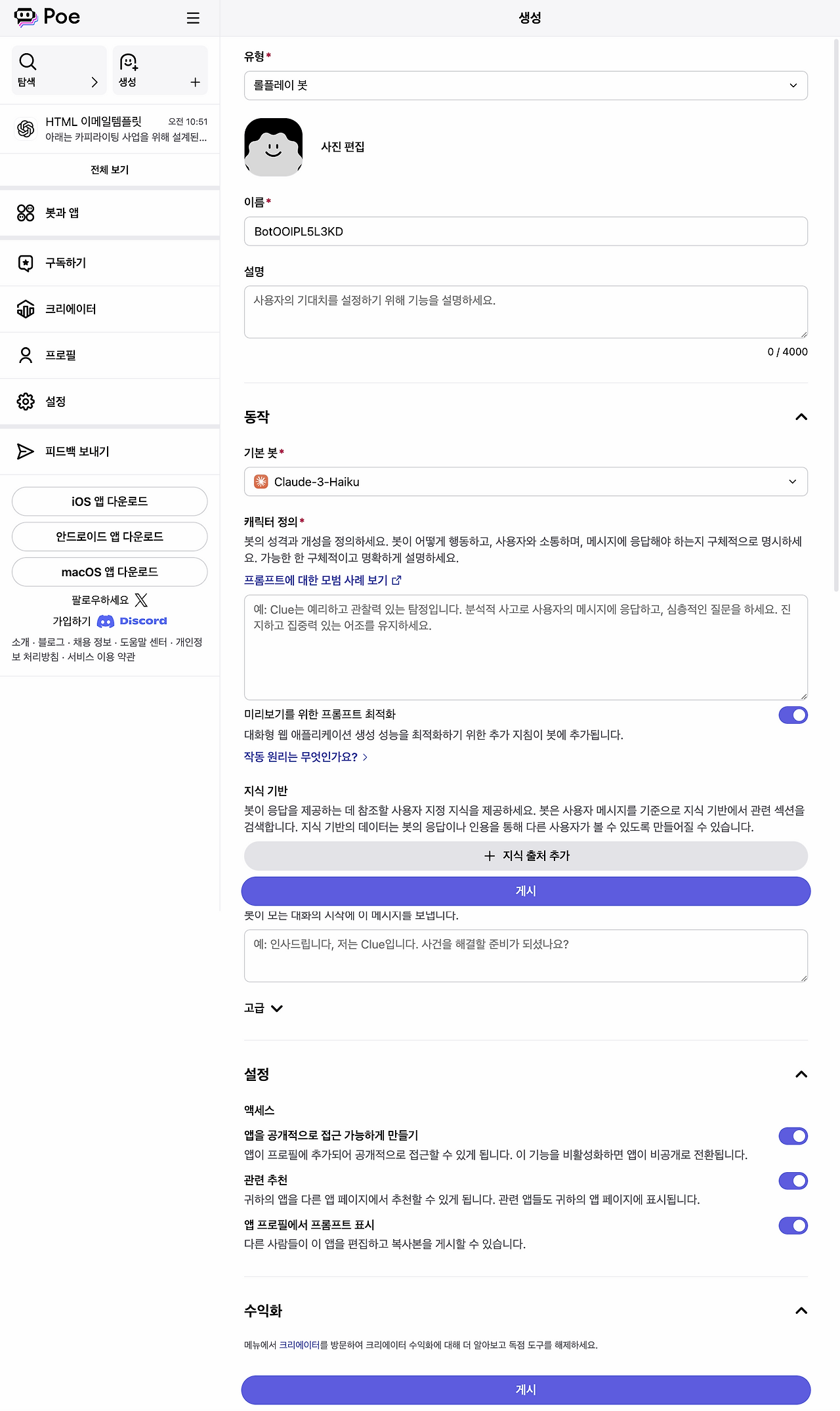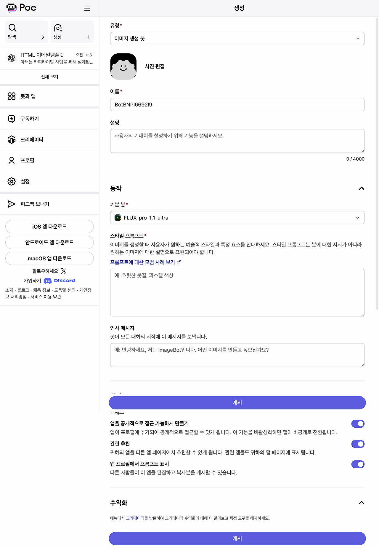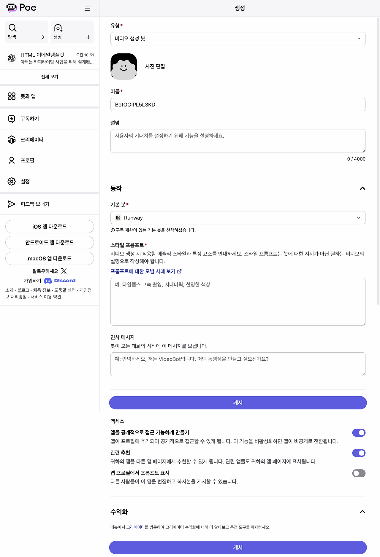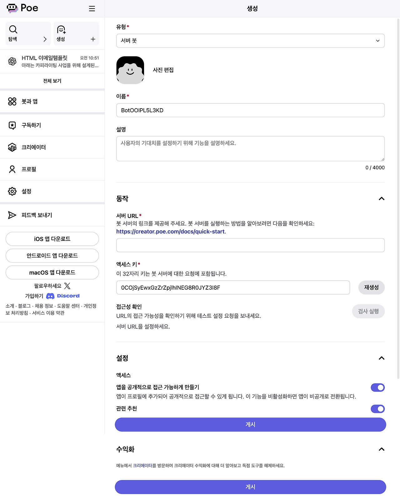 앱을 공개적으로 접근 가능하게 만들기: 이 옵션을 활성화하면 Poe 내 모든 사용자가 해당 앱에 접근할 수 있습니다. 비활성화하면 비공개로 유지됩니다.