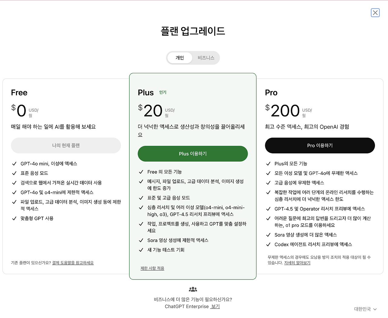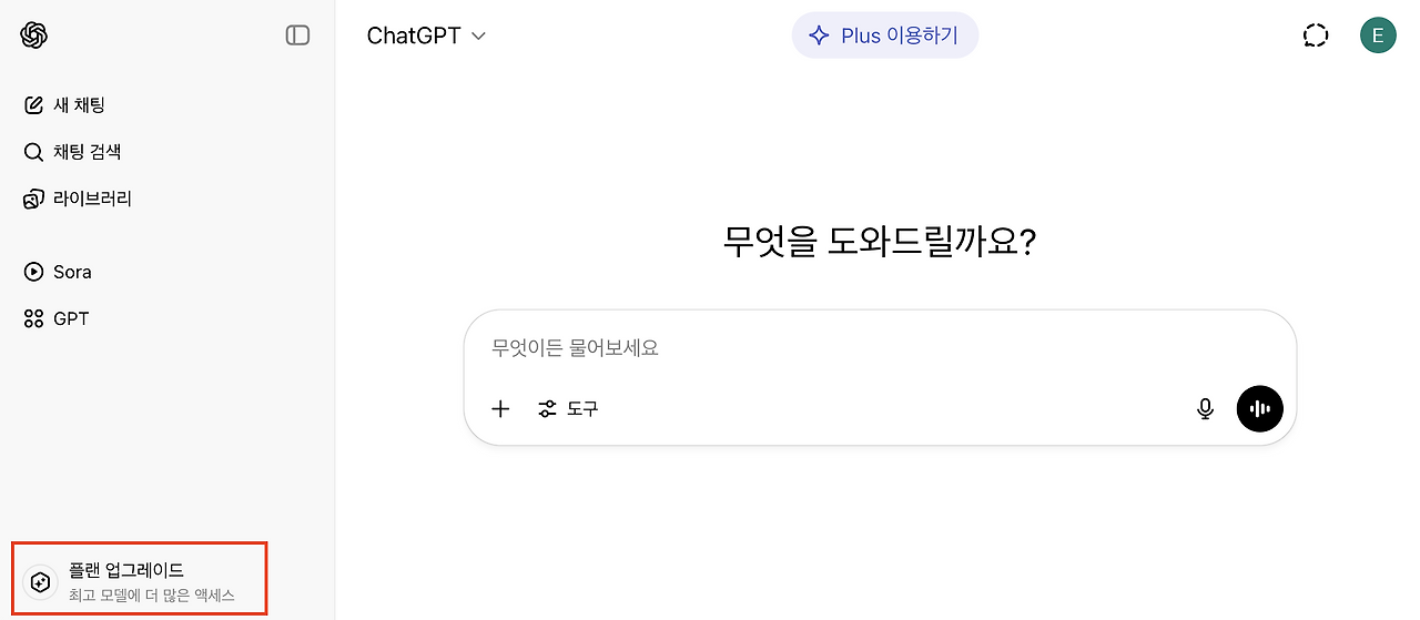 나만의 GPT를 만들기 위해서는 먼저 챗GPT Plus에 가입해야 합니다. 챗GPT 화면의 플랜 업그레이드 메뉴를 통해 가입할 수 있습니다.