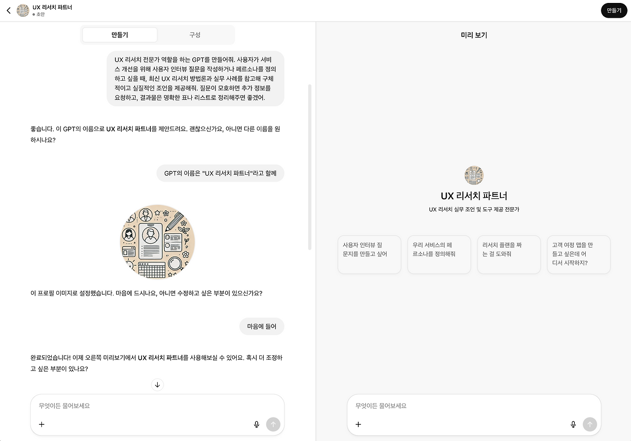 ‘만들기’ 탭은 초보자를 위해 간단하고 직관적인 인터페이스를 제공합니다. 사용자가 GPT의 역할이나 목적을 간단히 입력하면, 챗GPT가 그에 맞춰 역할을 설정하고 빠르게 GPTs를 생성해줍니다. 아이디어를 빠르게 구체화하고 싶을 때 매우 유용합니다.