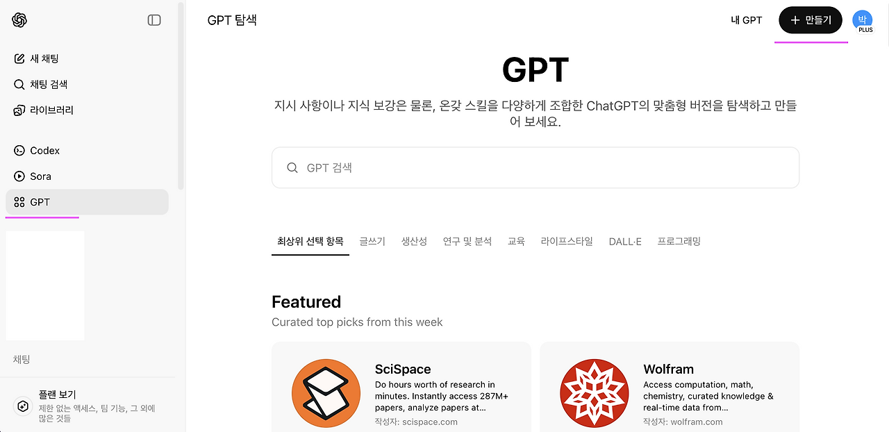 챗GPT 왼쪽 메뉴에서 ‘GPT’를 클릭하면, GPT 목록 화면으로 이동합니다. 여기서 [+ 만들기] 버튼을 누르면 GPT 생성 인터페이스가 열립니다.