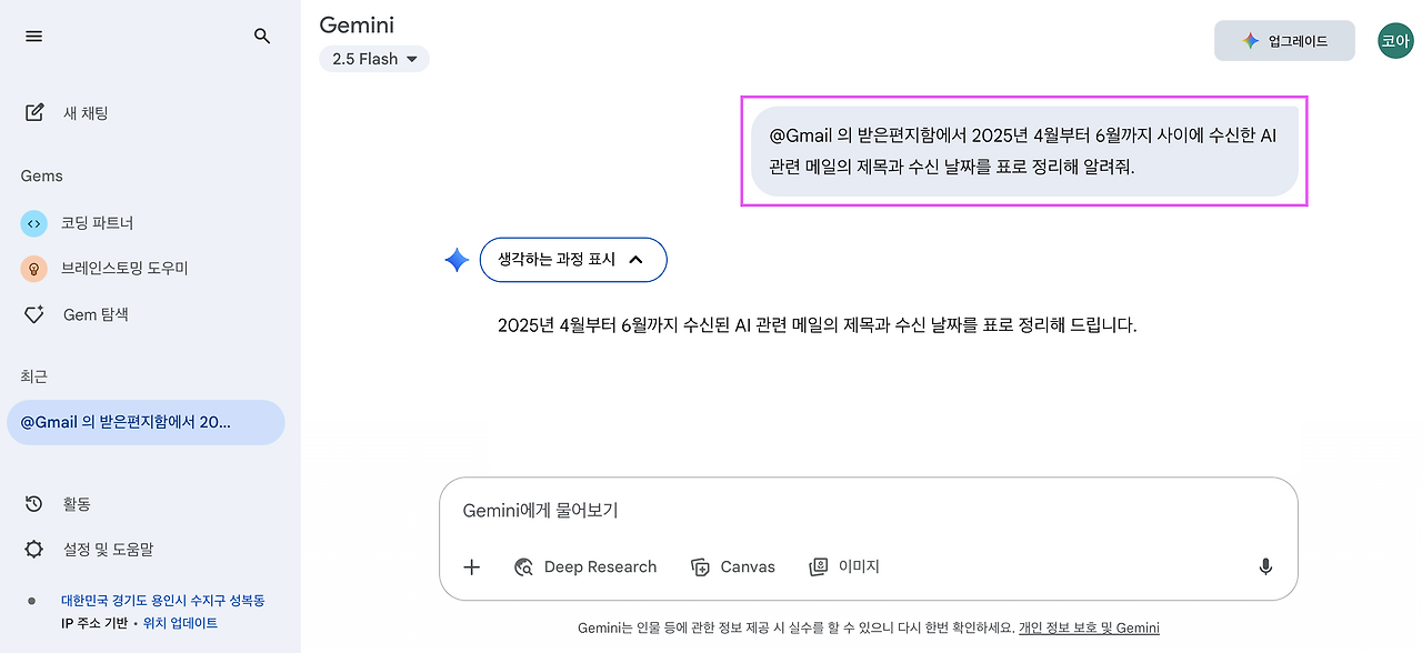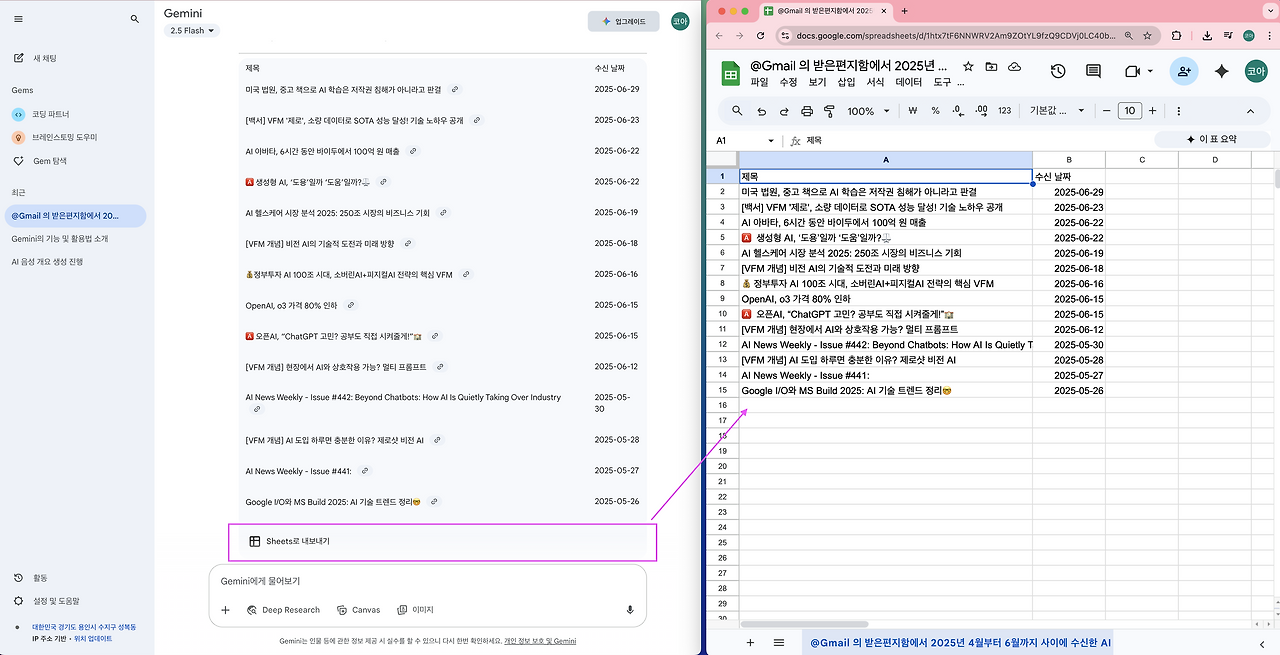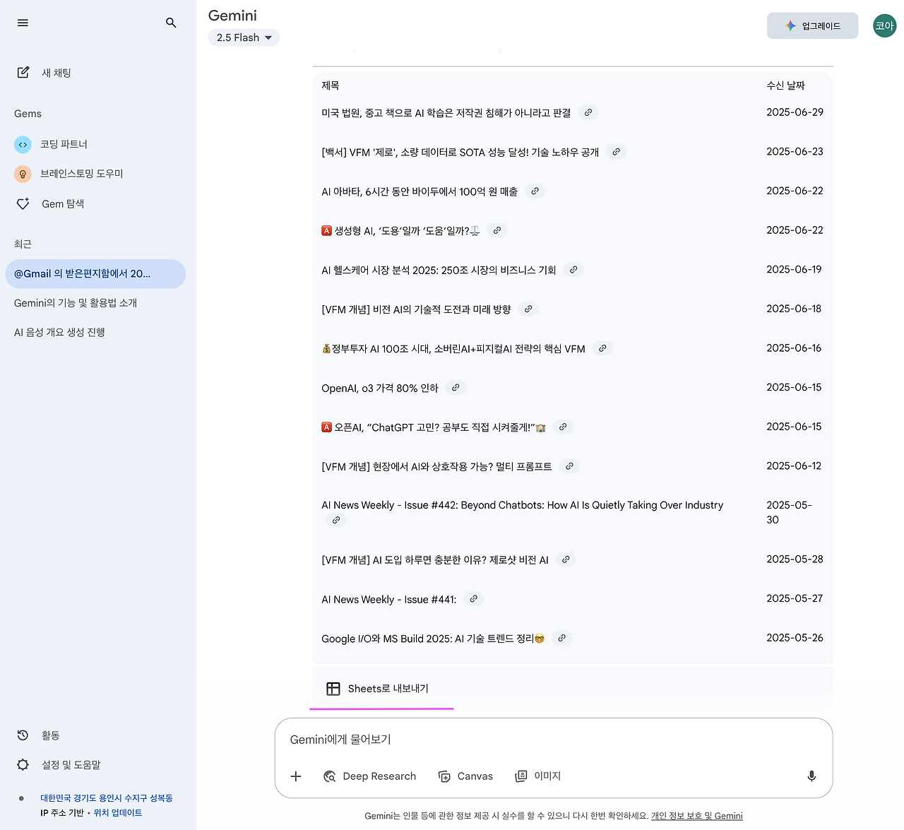 @Gmail 의 받은편지함에서 2025년 4월부터 6월까지 사이에 수신한 AI 관련 메일의 제목과 수신 날짜를 표로 정리해 알려줘.