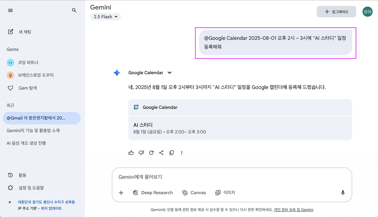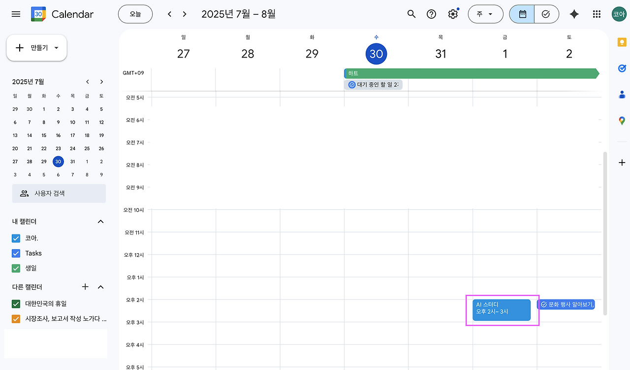 "@Google Calendar 2025년 8월 2일 오후 3시에 "AI 스터디" 일정을 등록해줘"