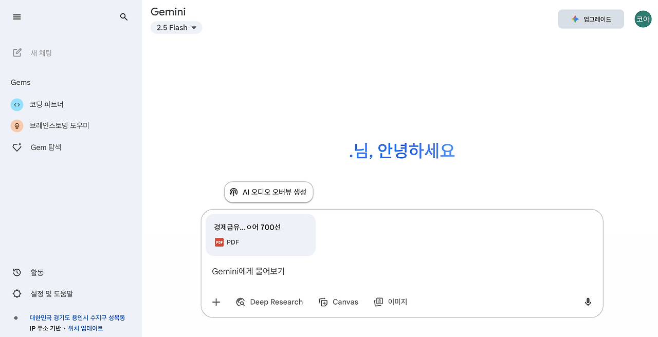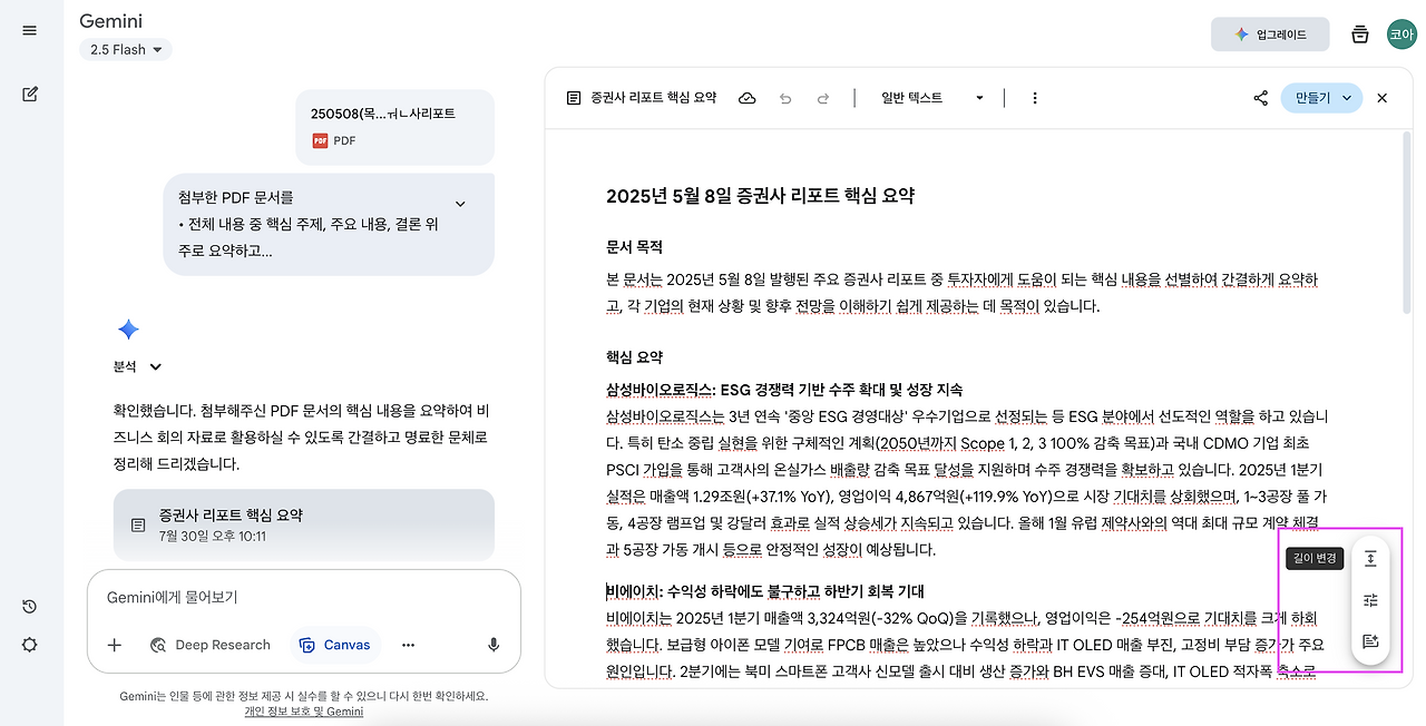 "캔버스"를 활용하면 Gemini와 함께 실시간 문서 작성도 가능합니다.