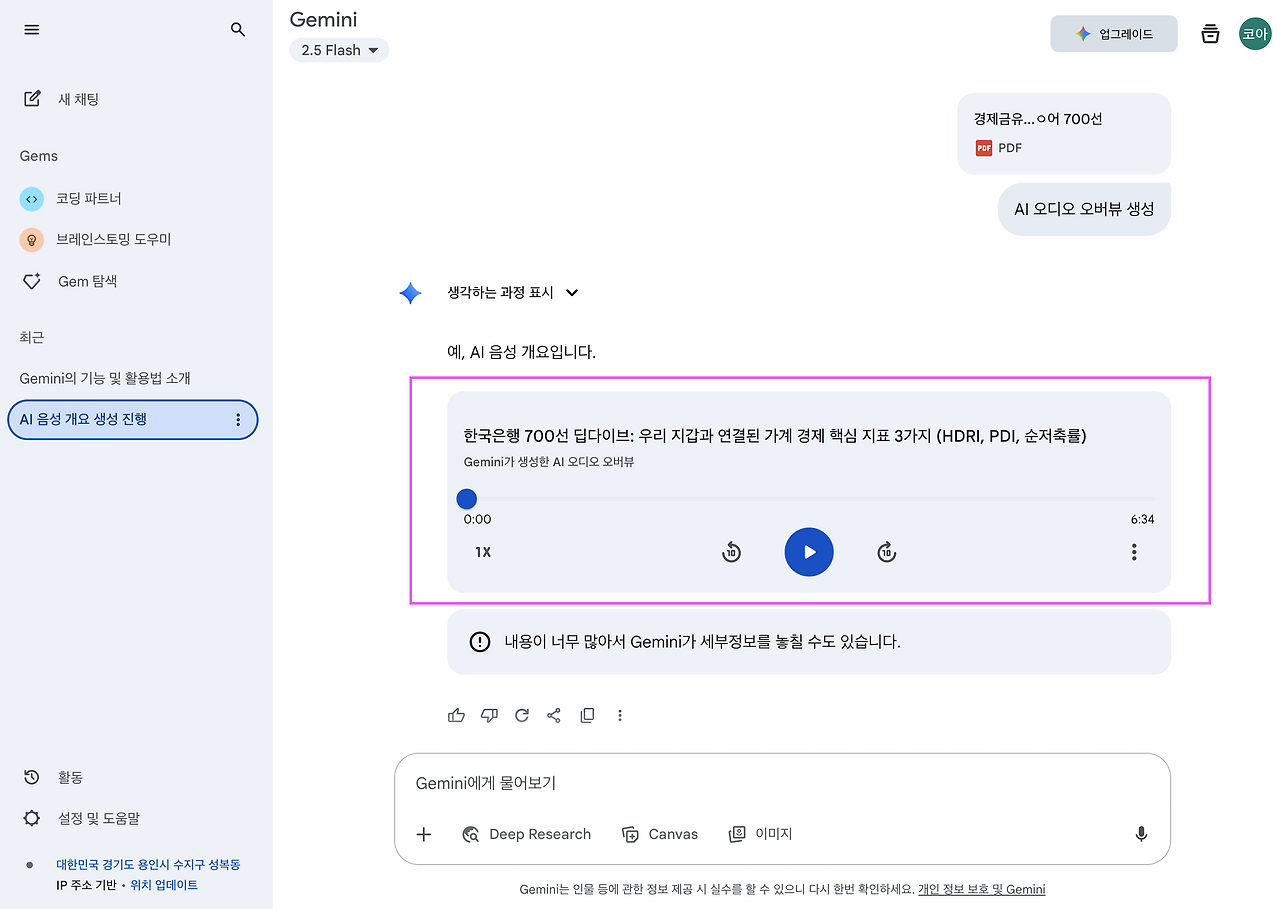 파일을 첨부하면 "AI 오디오 오버뷰 생성" 를 생성할 수 있어요. 영상 생성 시간은 약 1분 ~ 2분 정도 소요되며, 6분 ~ 7분 좌우의 AI 오디오가 생성됩니다.