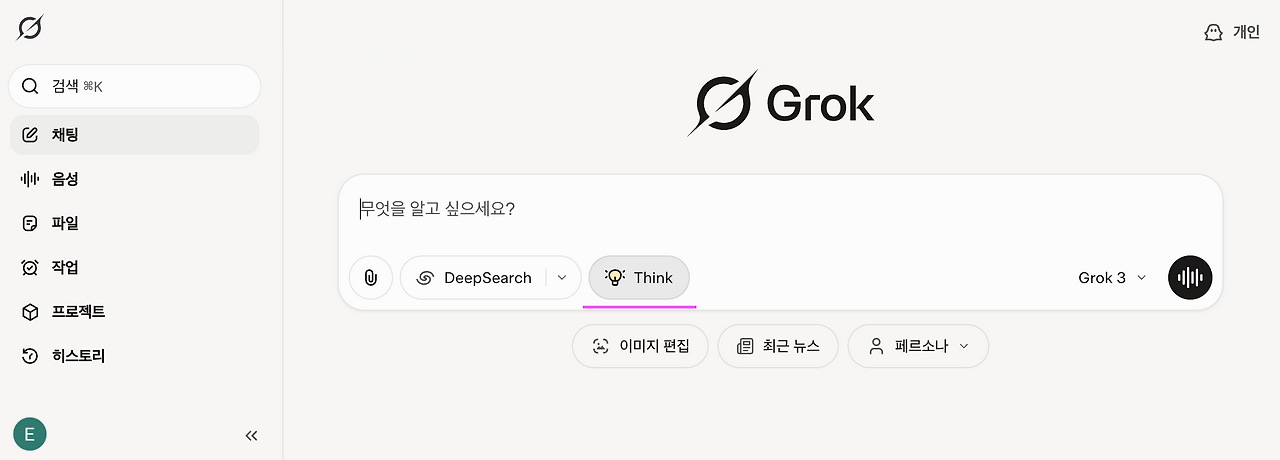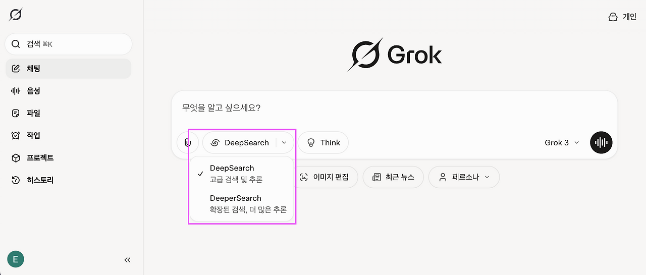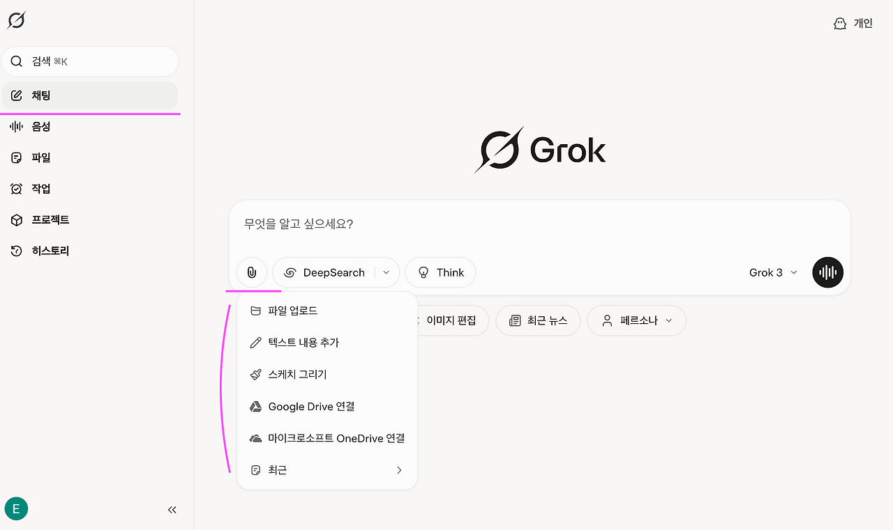 텍스트 입력은 물론이고, 파일 업로드, 그림 그리기, 클라우드 연동(Google Drive, OneDrive) 등 직관적인 입력 방식을 다양하게 제공하며, AI가 이를 기반으로 심화 검색(DeepSearch, DeeperSearch), 논리적 사고(Think), 이미지 편집, 뉴스 요약까지 수행할 수 있는 것이 특징입니다.