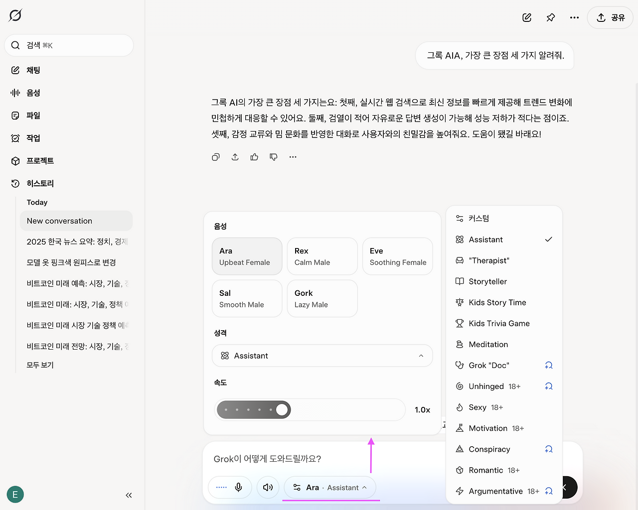 음파 모양의 아이콘을 클릭하고, '말하기'를 통해 Grok과 대화할 수 있습니다.