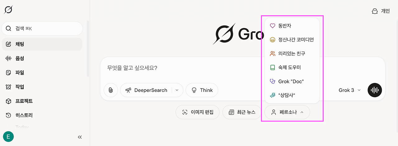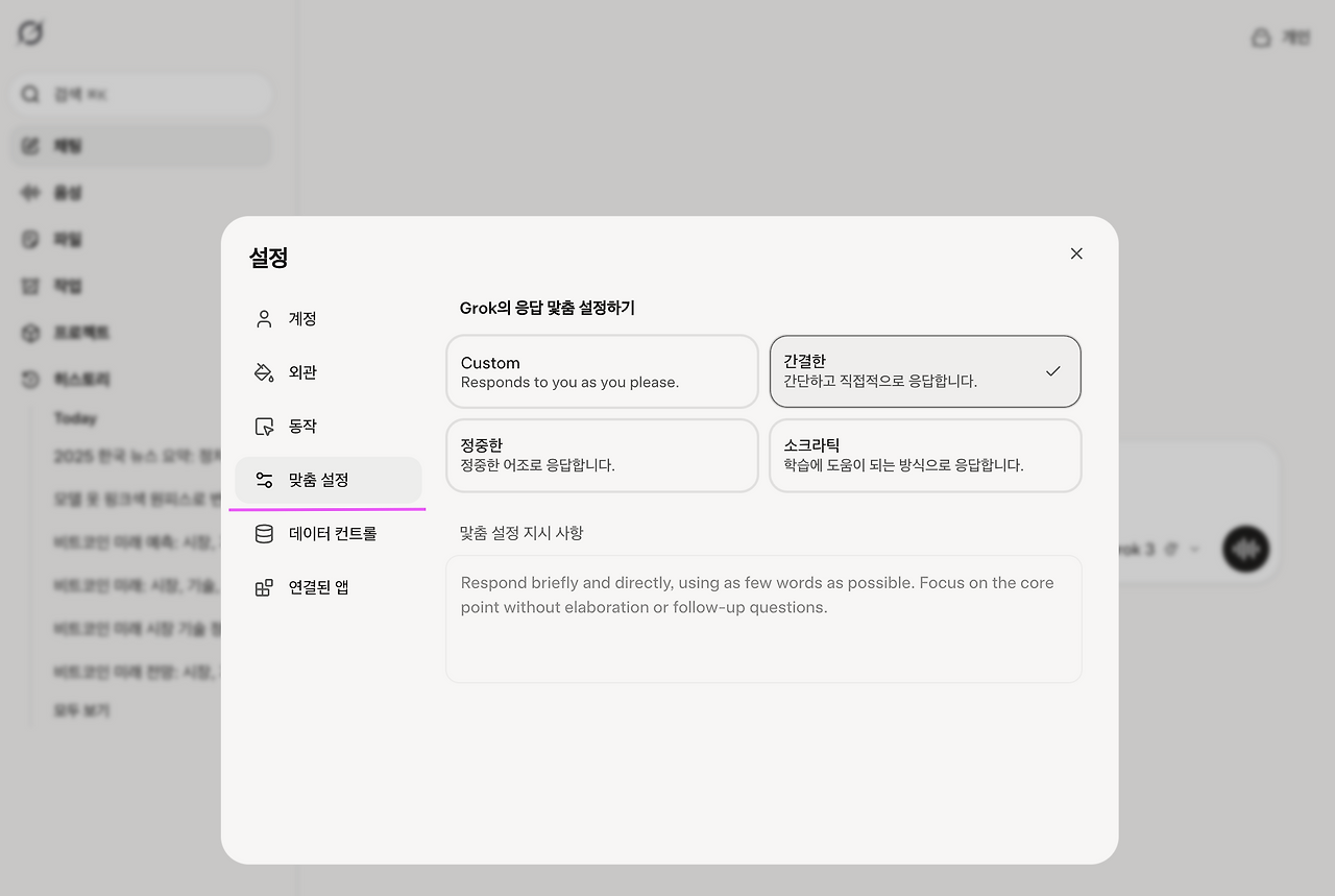 Grok의 답변하는 스타일이나 역할, 즉 AI의 ‘페르소나(성격, 말투 등)’를 설정할 수 있는 메뉴입니다.