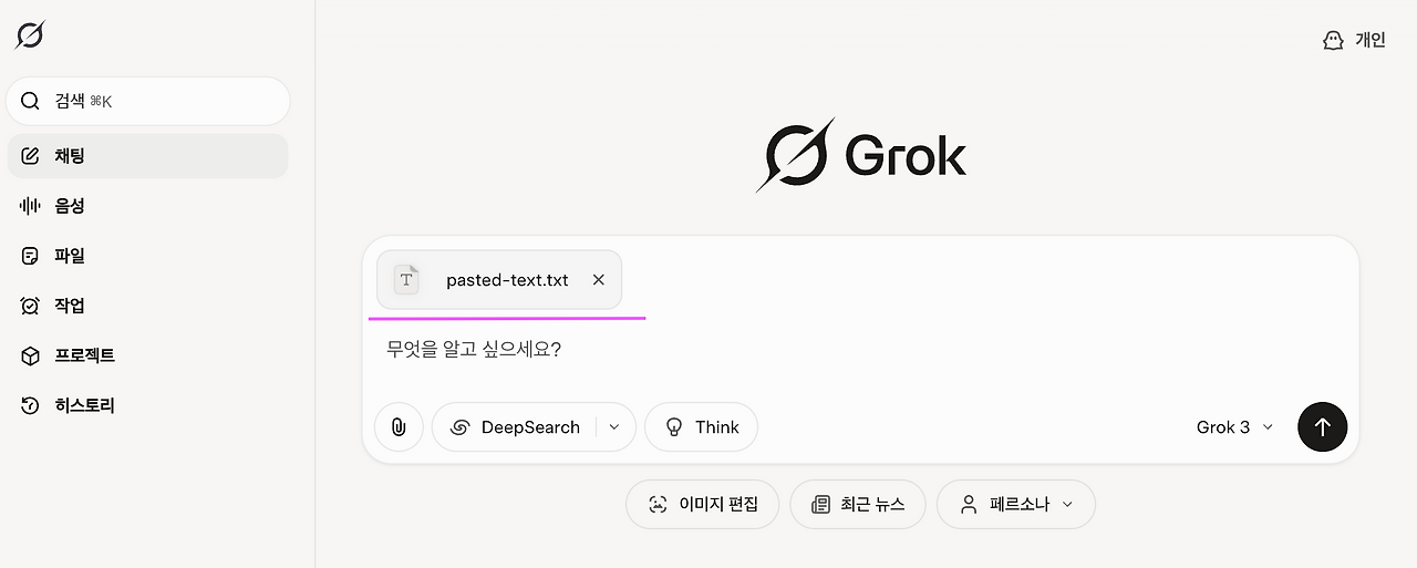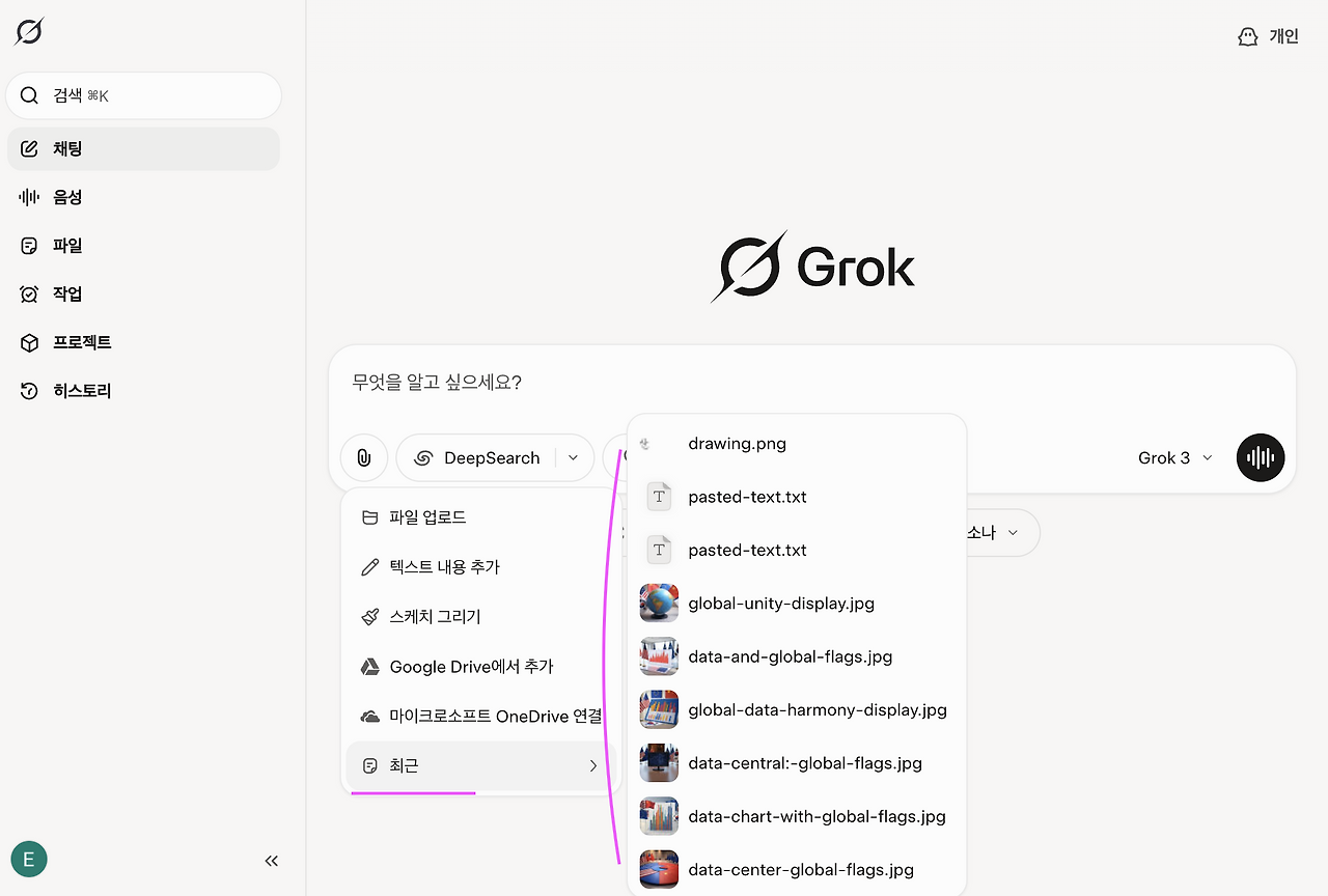 사용자의 컴퓨터(로컬)에서 파일을 직접 선택하여 Grok 채팅창에 첨부합니다.