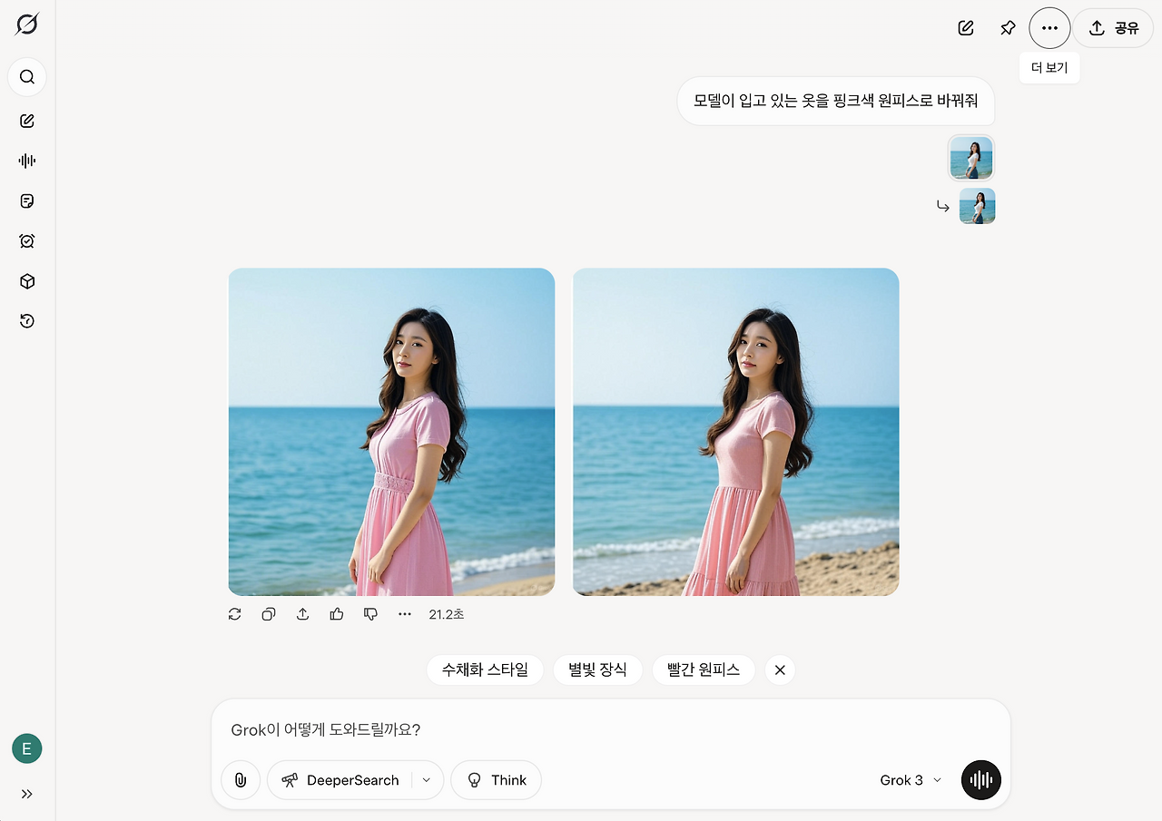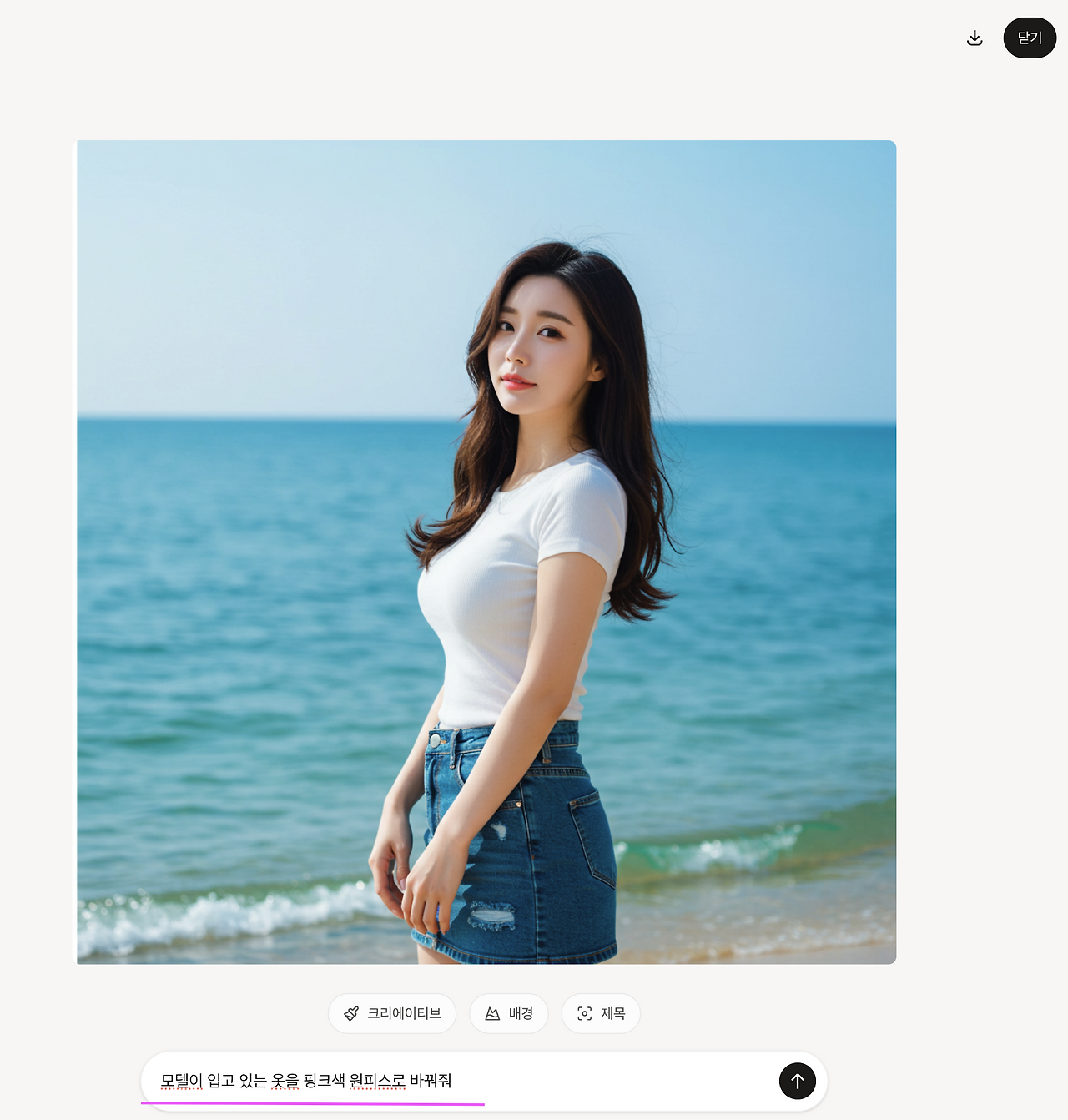 프롬프트에 "모델이 입고 있는 옷을 핑크색 원피스로 바꿔줘"로 입력해보겠습니다.