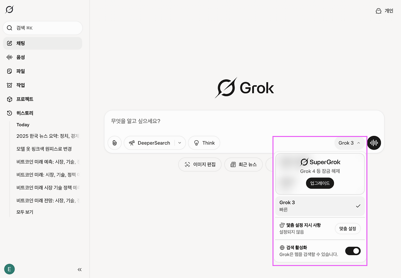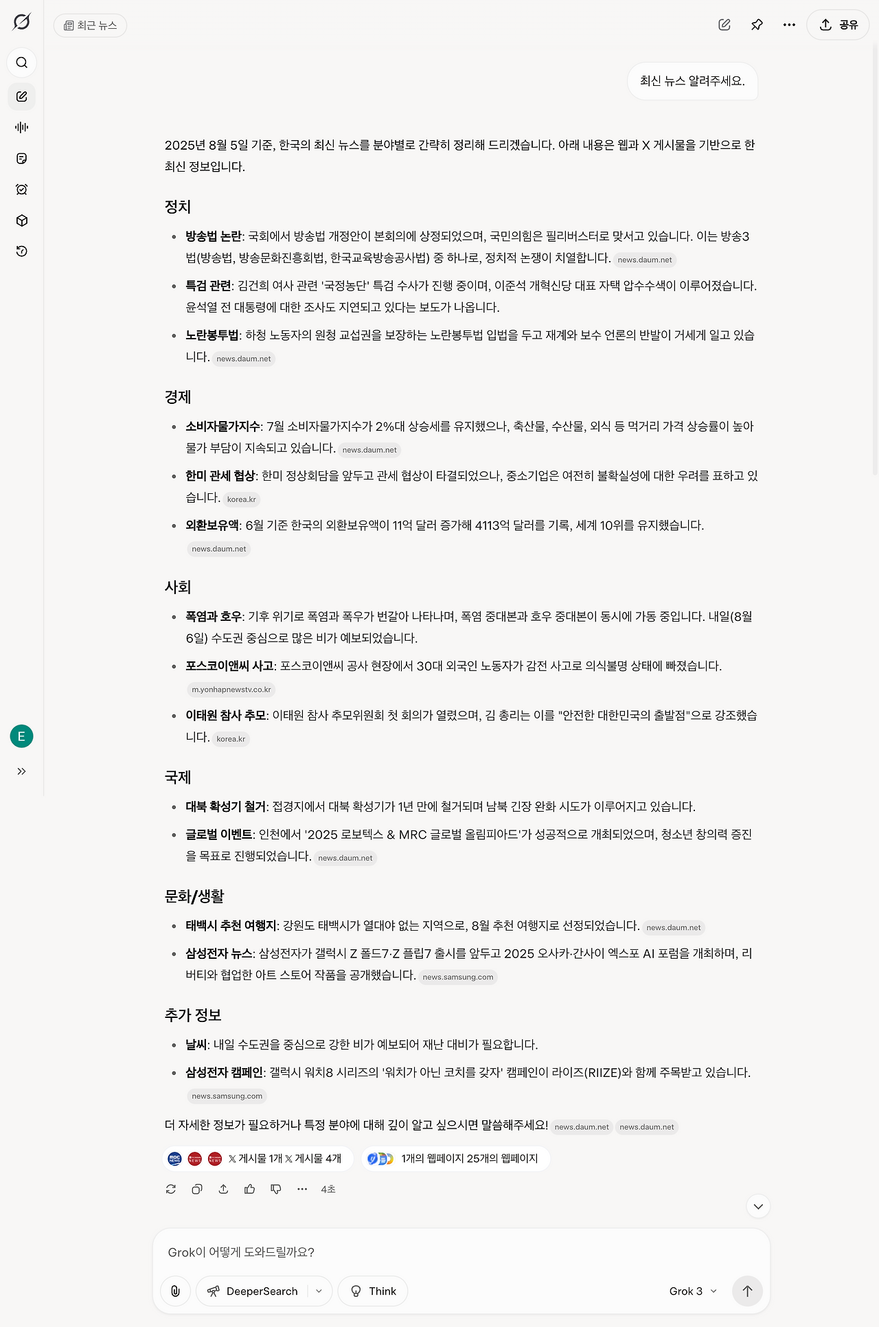 Grok이 실시간으로 웹 검색과 X(구 트위터) 검색하여 정보를 제공합니다.