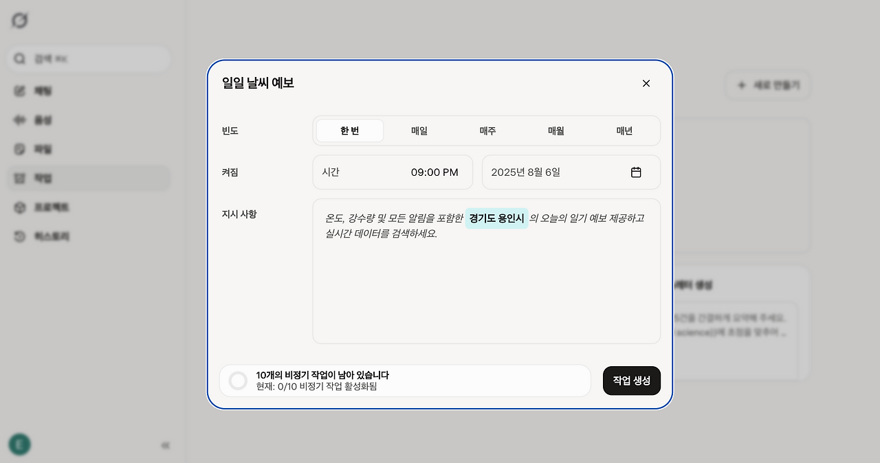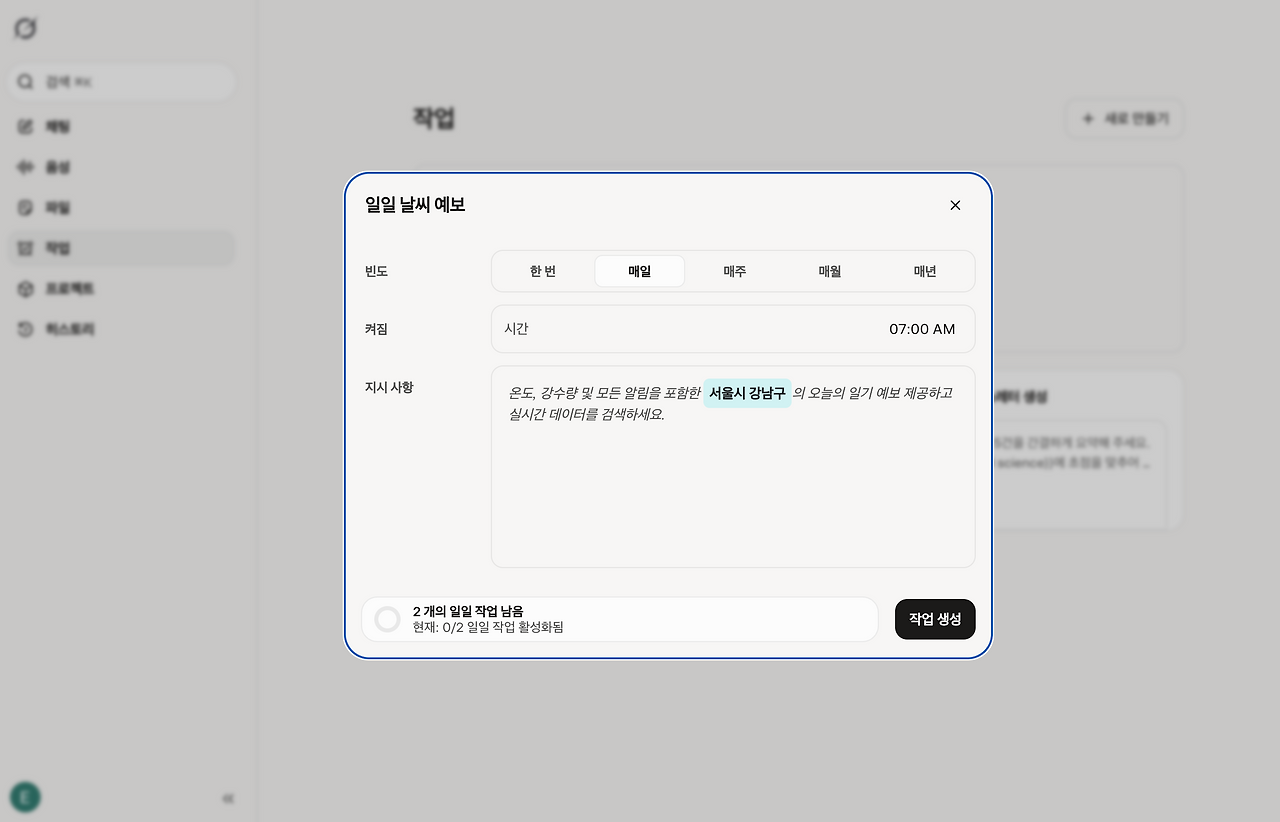 작업의 빈도는 한 번, 매일, 매주, 매월, 매년 중에서 선택할 수 있으며, 전송 시간과 지시사항도 설정할 수 있습니다. 또한, 일일 작업은 최대 2개까지 생성할 수 있습니다.