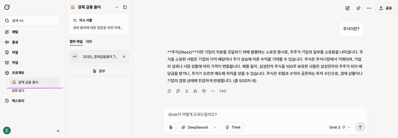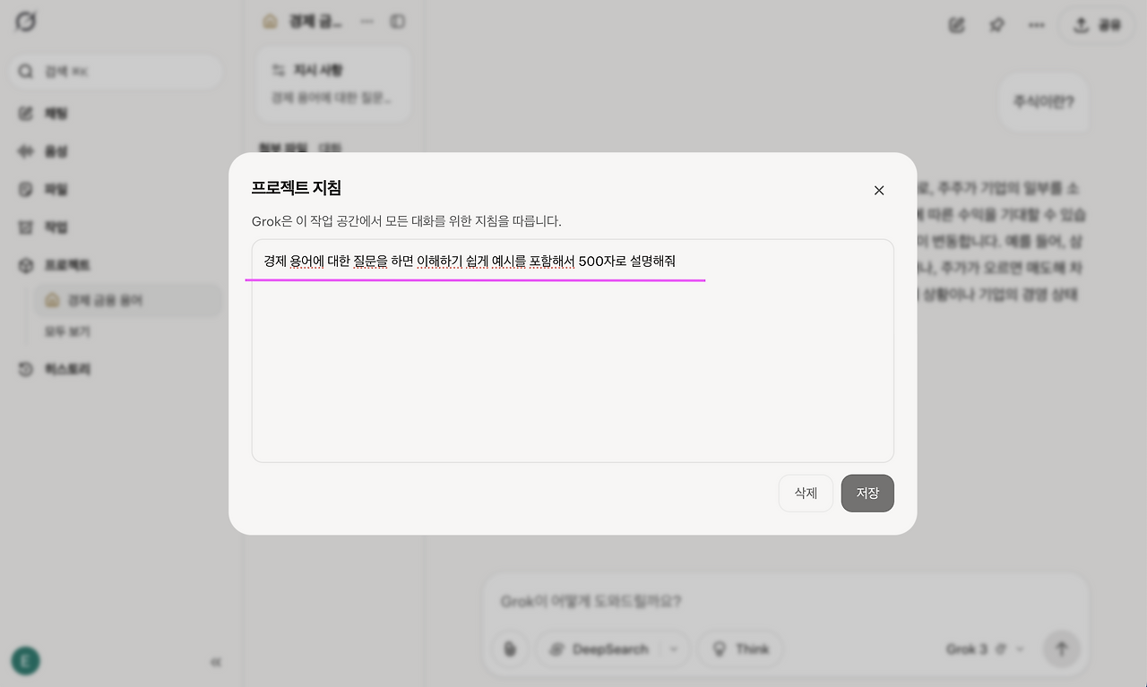 Grok의 "프로젝트(Project)"는 특정 주제나 작업을 체계적으로 관리할 수 있는 공간입니다.