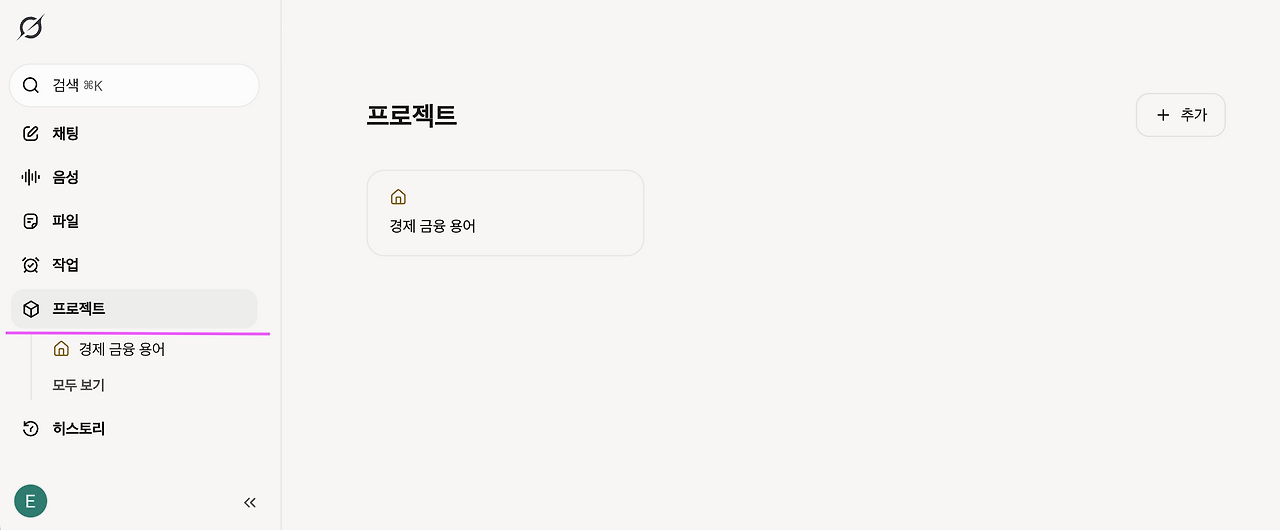 상단에 프로젝트 이름이 표시 (새 프로젝트, 경제 금융 용어 등)되며 수정이 가능합니다.