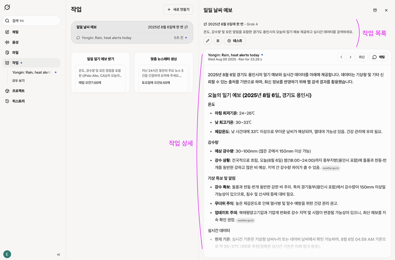 Grok의 '작업(Tasks)' 기능은 원하는 작업을 일정에 따라 자동 실행하고, 결과를 받아볼 수 있게 하는 자동화 도구입니다.