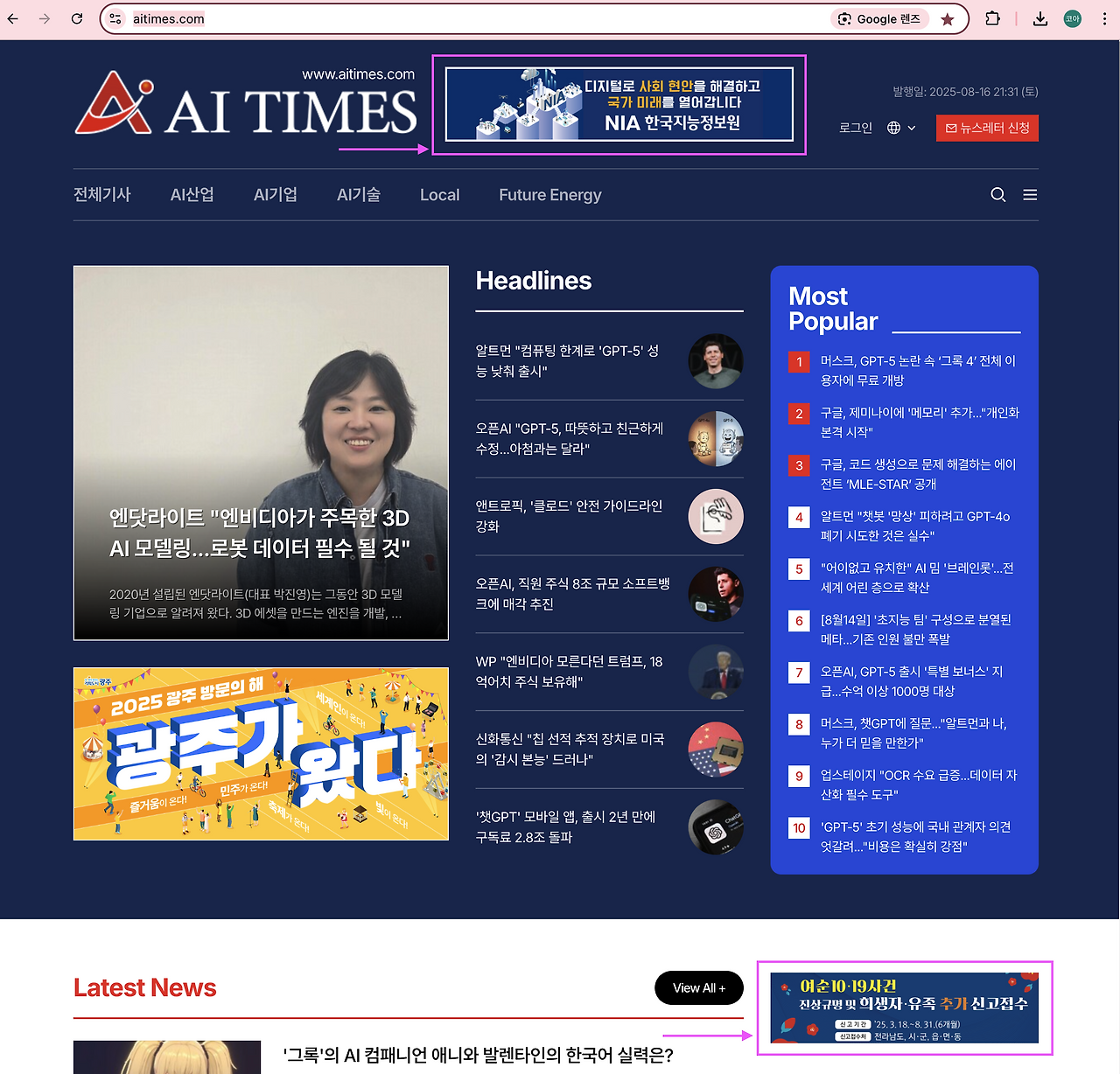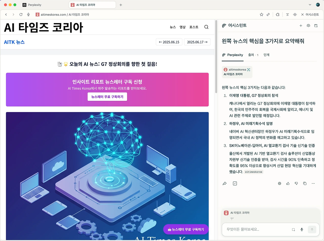 예를 들어 AI 타임즈 사이트(https://www.aitimes.com/)를 열어보면, 크롬에서는 여기저기 배너 광고가 뜨지만 코멧에서는 광고 없이 본문만 보이죠. 집중력 있게 콘텐츠를 소비하고 싶은 사용자에게 최적화된 환경을 제공합니다.