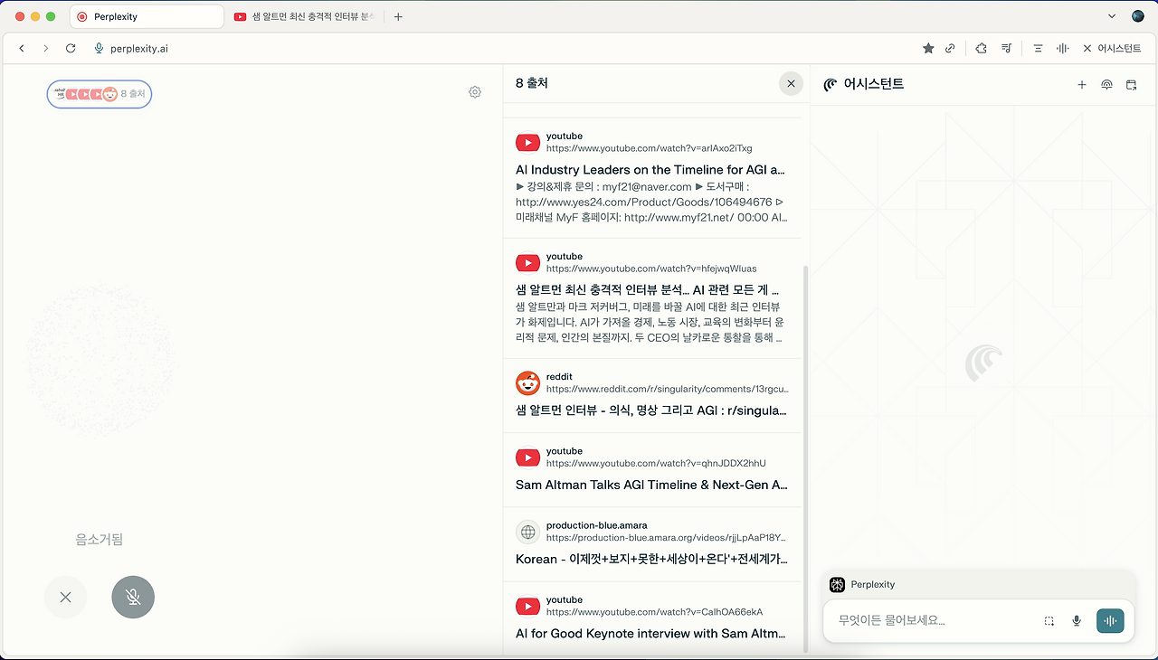 글자를 입력하지 않고 음성으로 질문할 수도 있습니다. 브라우저 하단의 [마이크 아이콘]을 누르고 “샘 알트먼이 AGI에 대해 인터뷰한 유튜브 영상을 찾아줘”라고 말하자, 관련 영상 8개가 즉시 목록으로 나타났습니다.