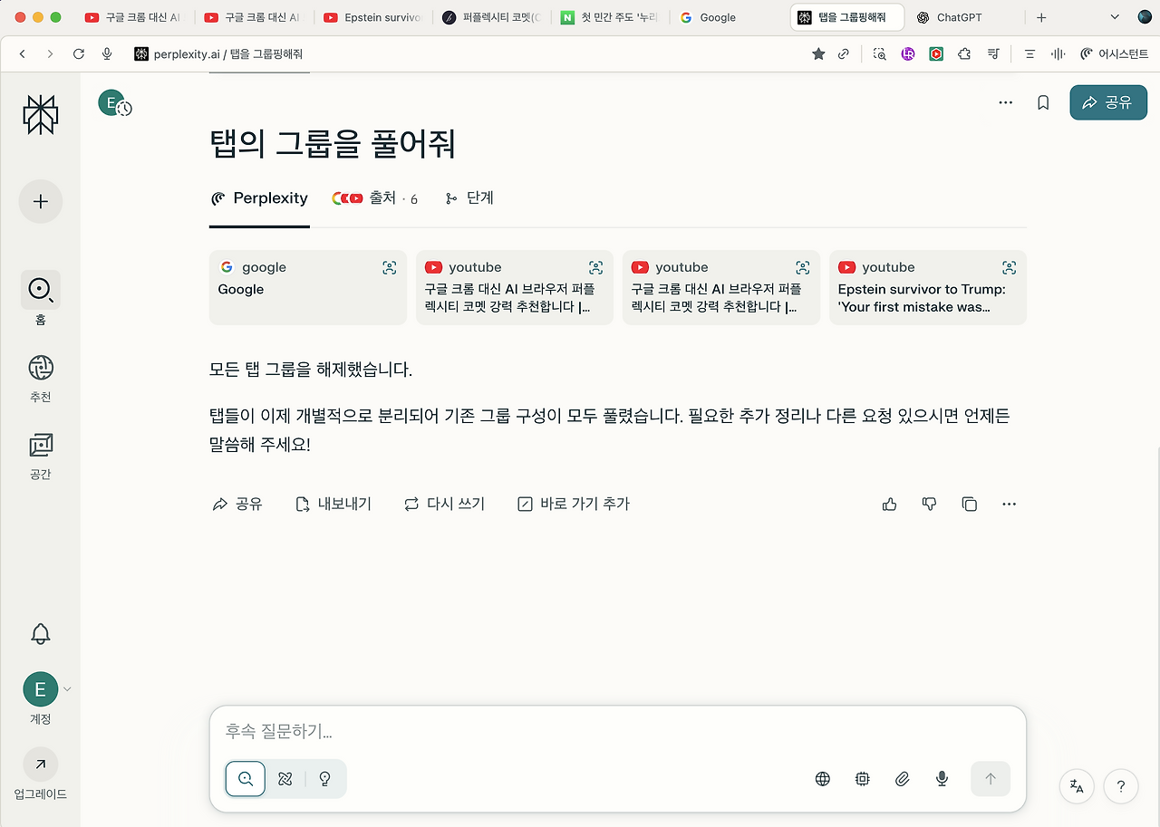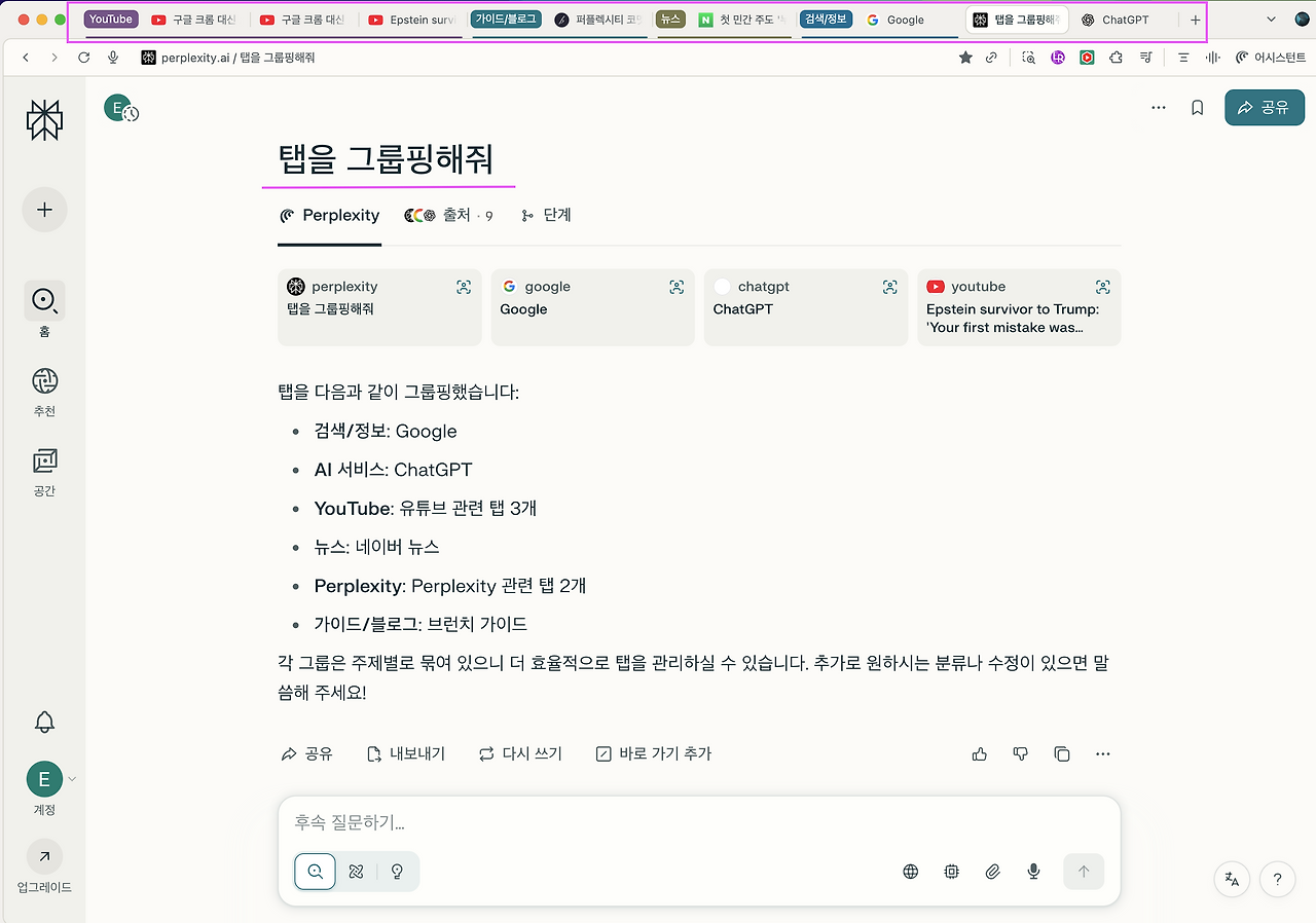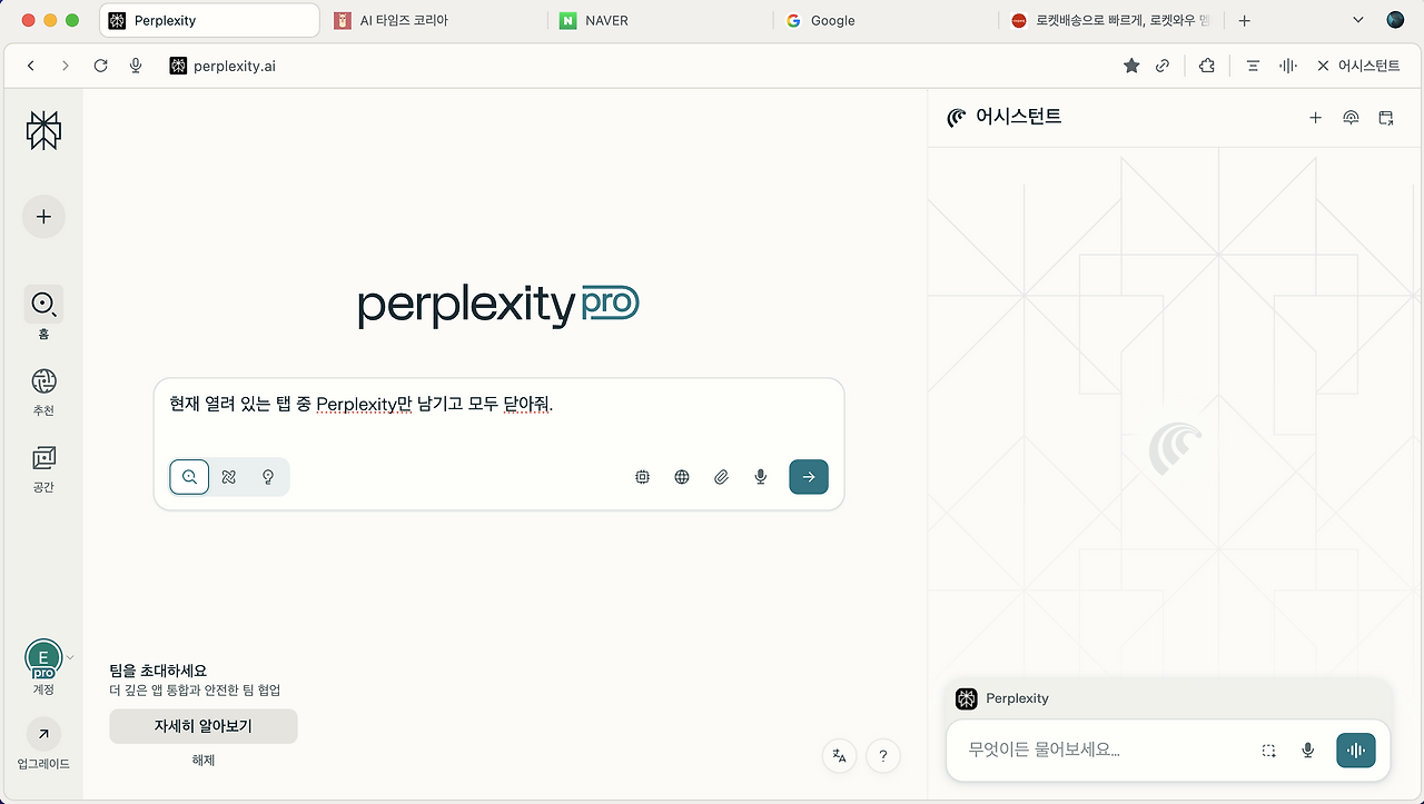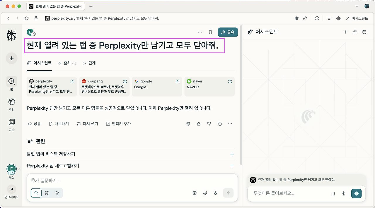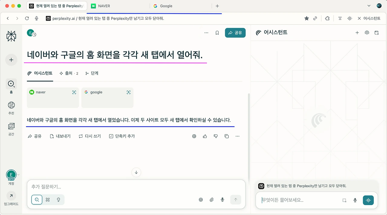 예를 들어 “현재 열려 있는 탭 중 Perplexity만 남기고 모두 닫아줘”라고 하면 필요한 것만 남겨주고, “네이버와 구글의 홈 화면을 각각 새 탭으로 열어줘”라고 하면 즉시 새 탭이 깔끔하게 열립니다. 여러 창을 동시에 관리하는 사람이라면 특히 편리하게 느낄 기능입니다.