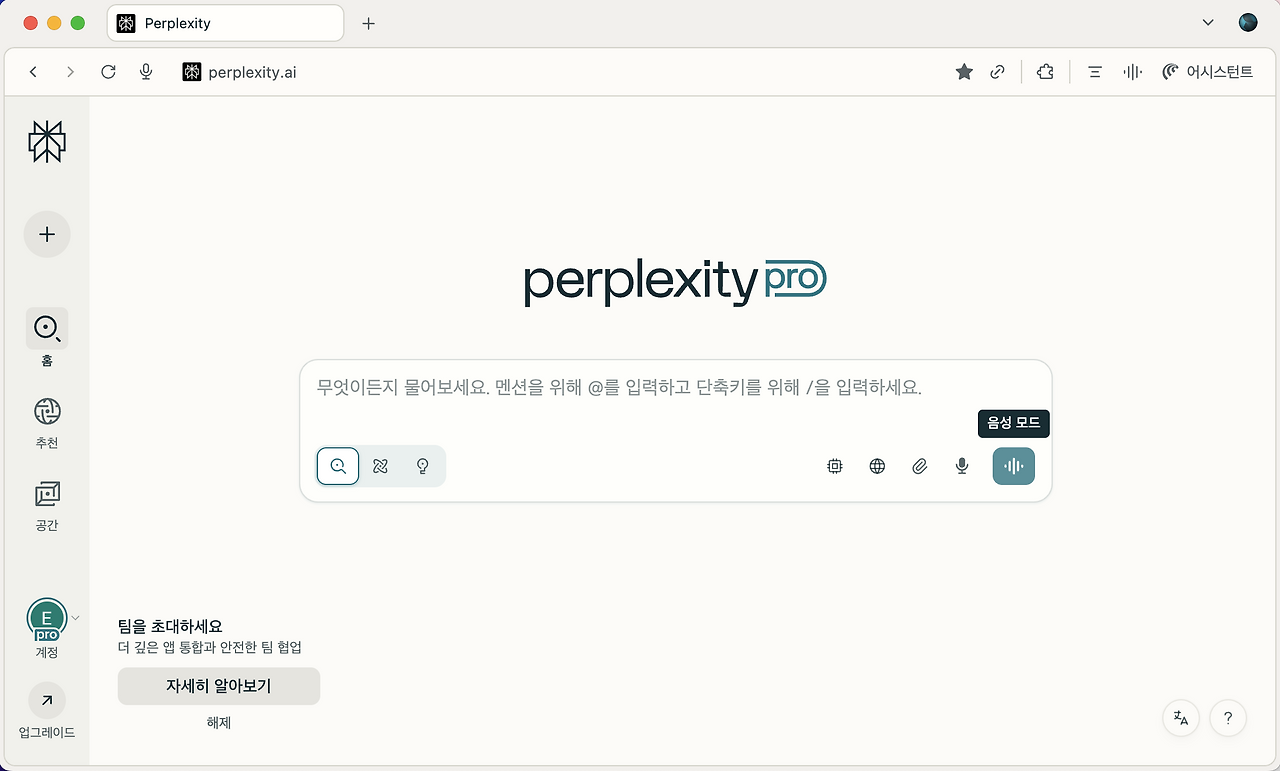 질문 입력 창에 "@"를 입력하면, 현재 열려있는 탭과 Perplexity의 "공간"에 만든 나만의 GPTs 비서가 출력되고, 바로 이에 대한 질문을 할 수 있습니다.