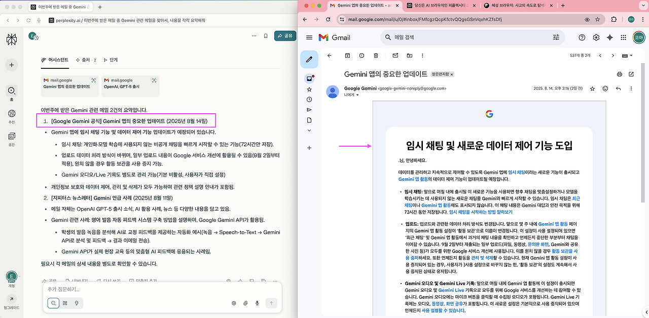 또한 Gmail·캘린더와도 연동되어 브라우저 내부에서 바로 메일·일정관리까지 할 수 있어, 검색·정리·실행·관리의 모든 과정을 하나의 환경에서 누릴 수 있습니다.