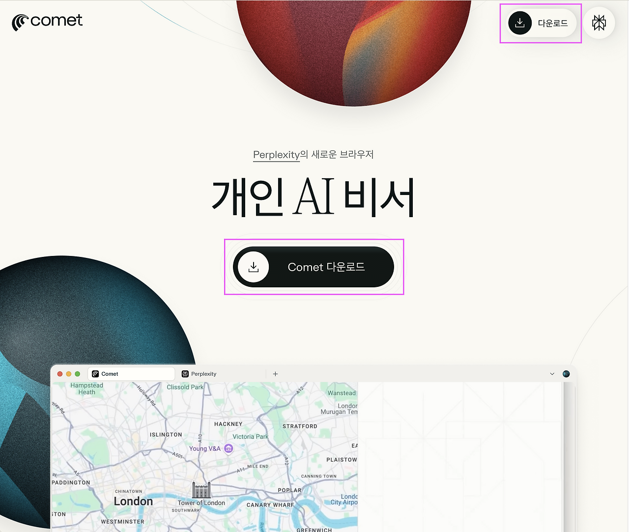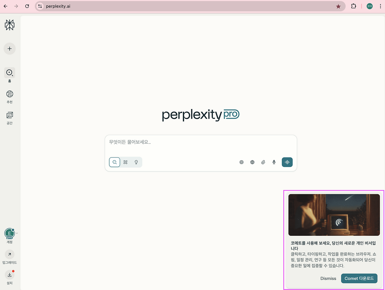 2. 또는 Perplexity 메인 화면의 하단 배너 클릭 → [Comet 다운로드] 버튼 선택