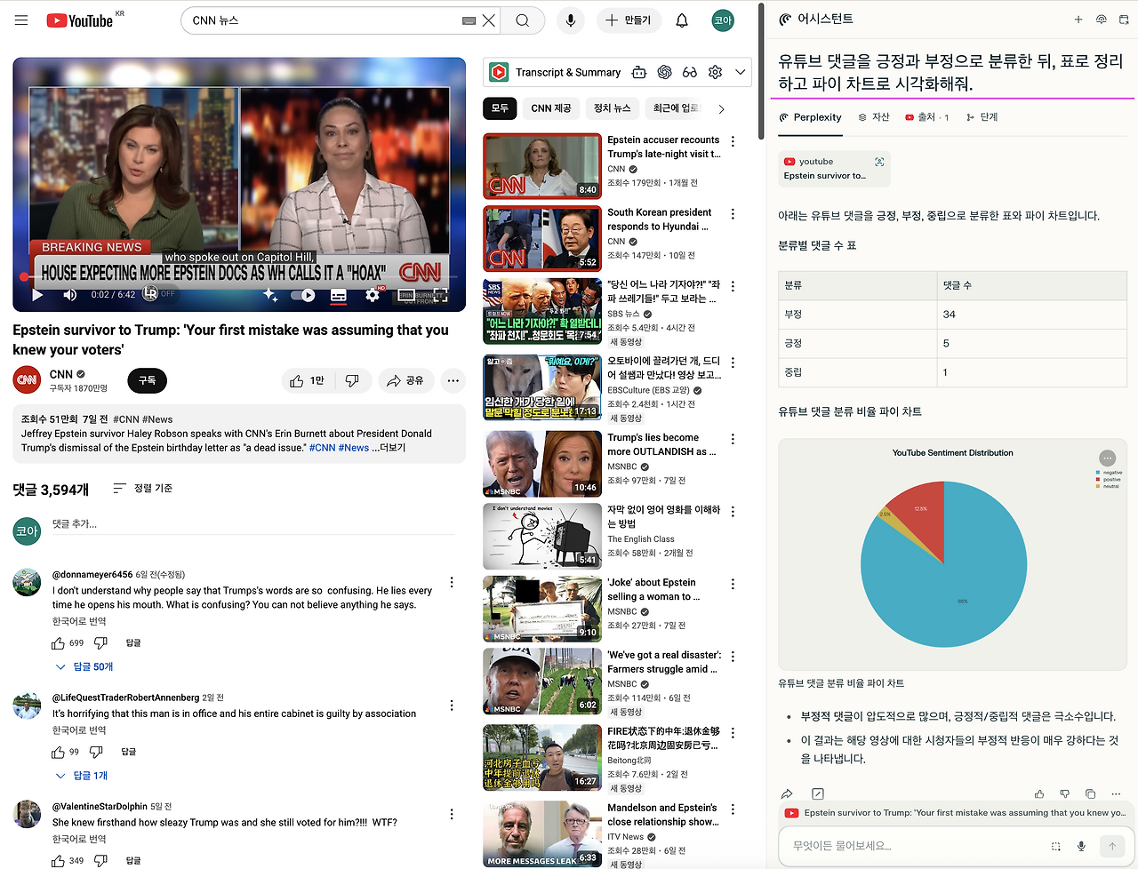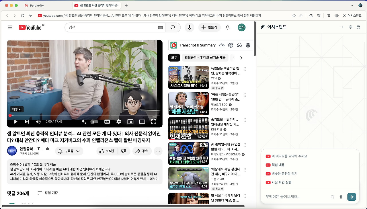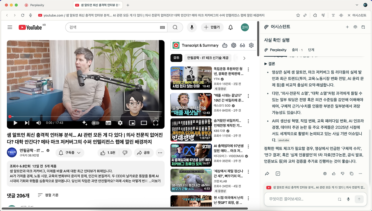 이어 “첫 번째 영상을 열어줘”라고 요청하면 바로 실행되고, 오른쪽 어시스턴트 패널에서 요약·핵심정리·비슷한 영상 찾기·사실 확인까지 이어서 할 수 있었습니다. 특히 영상 내용을 팩트 체크해주는 기능은 기존 브라우저에서는 상상하기 힘든 경험이었습니다.