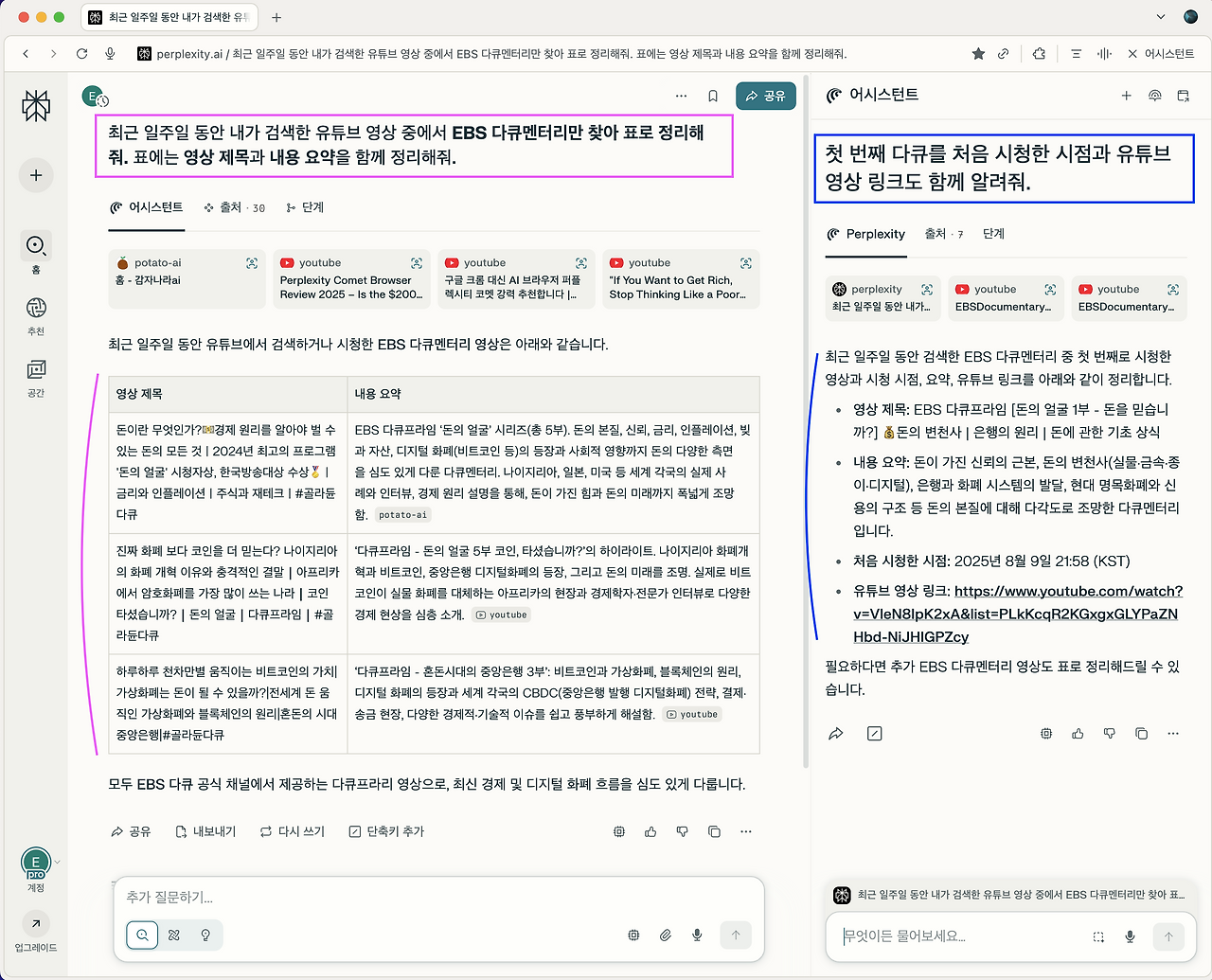 예를 들어 “최근 일주일 동안 내가 본 유튜브 영상 중 EBS 다큐멘터리만 표로 정리해줘”라고 입력하면, 영상 제목·내용 요약·링크까지 한눈에 볼 수 있게 정리해 줍니다. 개인화된 검색 비서 같은 느낌이 강합니다.