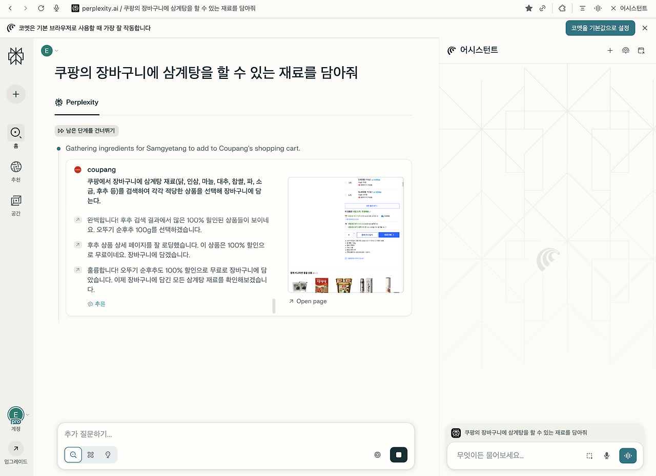예를 들어 “쿠팡의 장바구니에 삼계탕 재료를 담아줘”라고 입력했더니, 닭·인삼·마늘·대추·찹쌀·파·소금·후추까지 알아서 찾아 장바구니에 담아주는 모습을 확인할 수 있었습니다.