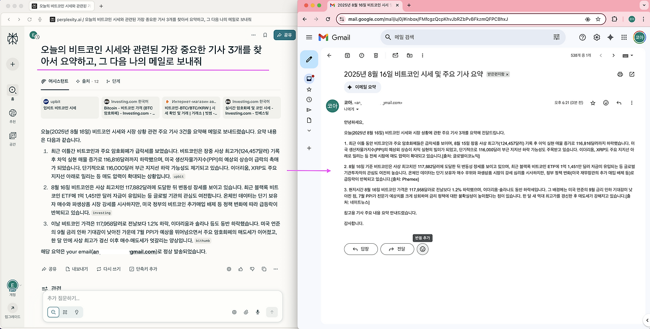 또한 “오늘의 비트코인 시세 관련 주요 기사 3개를 찾아서 요약하고, 내 메일로 보내줘”라고 했더니, 기사 요약뿐 아니라 메일 발송까지 문제없이 진행되었습니다. 업무 효율이 확실히 달라지는 순간입니다.