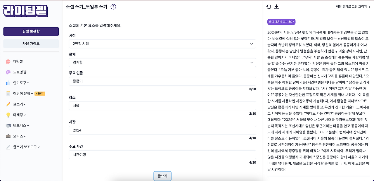 '소설 패키지'를 선택하고 소설의 기본 요소인 시점, 문체, 주요 인물, 장소, 시간, 주요 사건을 입력하고 글쓰기 버튼을 누릅니다. 저는 2인칭 시점으로 콩콩이라는 강아지가 2024년 서울에서 시간 여행을 하는 주제로 작성해 보았습니다. 시간 여행을 하며 겪는 모험담을 매우 재미있게 전개하고 있네요.