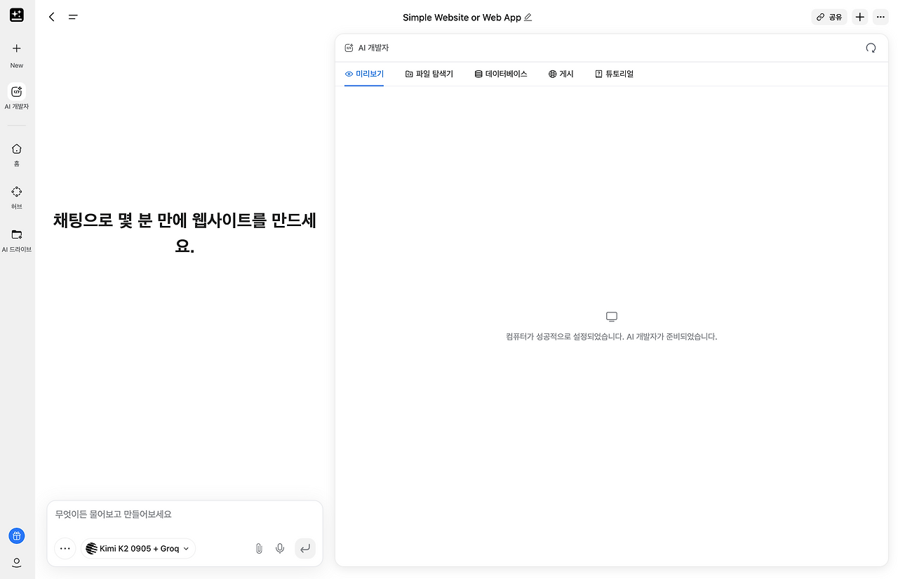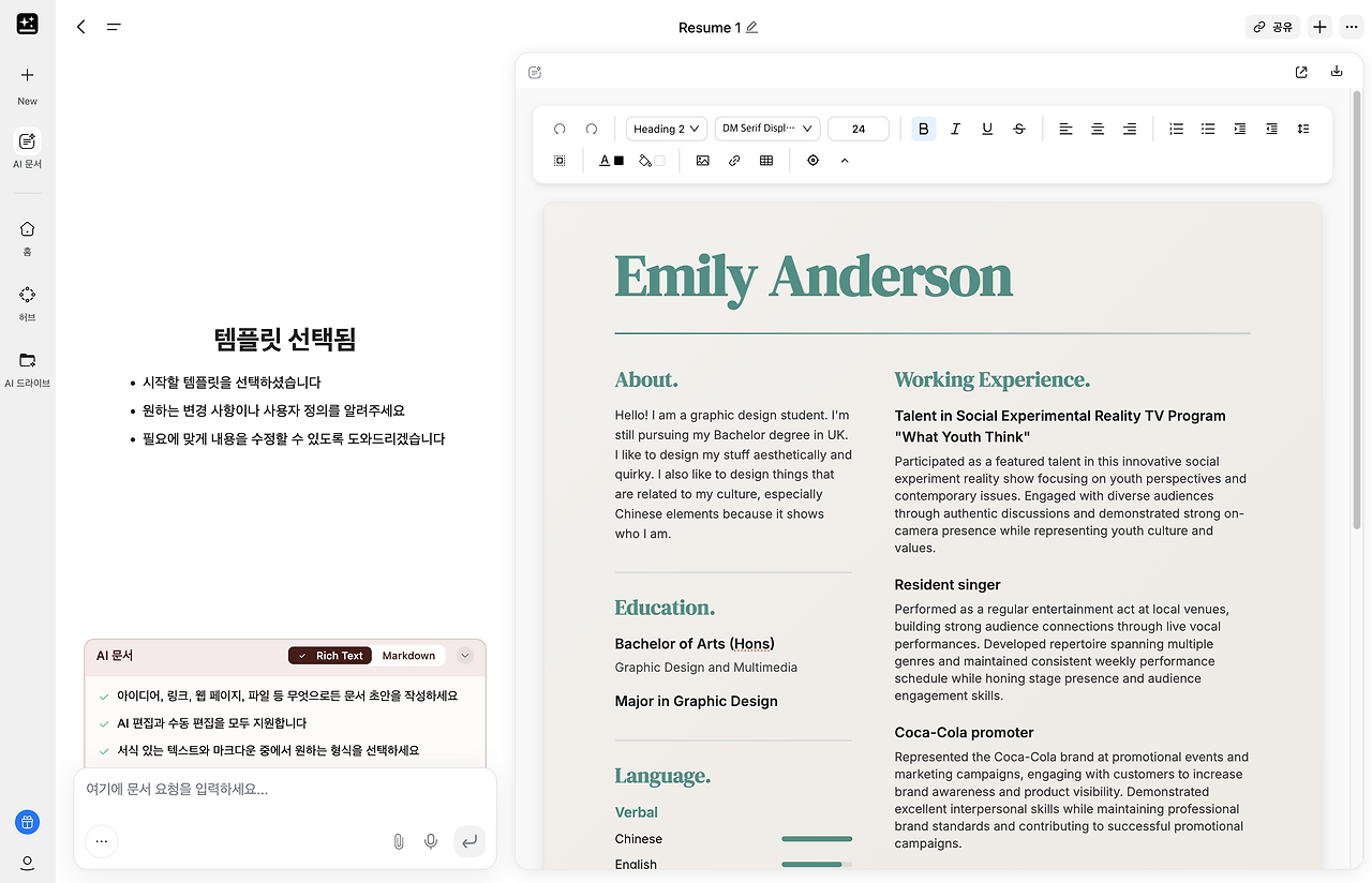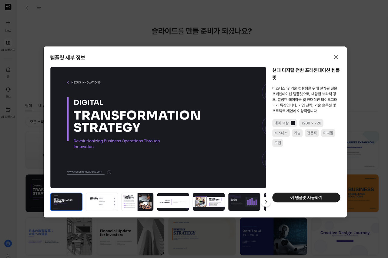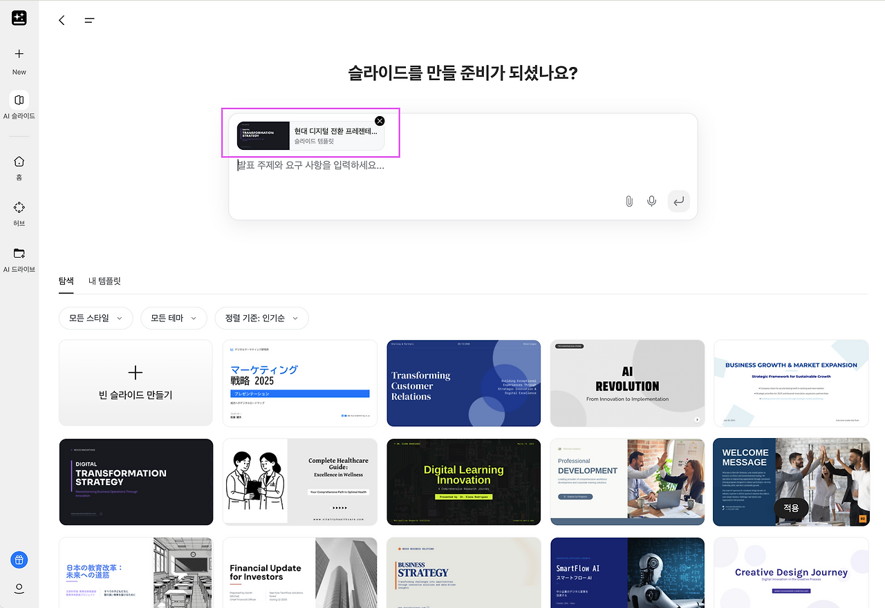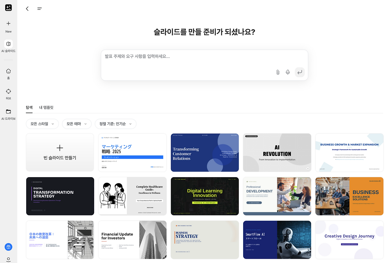 AI 슬라이드 메뉴에서는 간단한 키워드와 초안만 입력하면 전문적인 프레젠테이션 자료를 빠르게 완성할 수 있습니다. 사용자는 복잡한 디자인이나 내용 구성 고민 없이 단 몇 분만에 보고서, 발표자료, 마케팅 자료 등 다양한 목적의 슬라이드를 만들 수 있습니다.