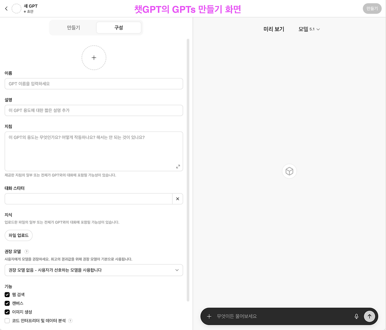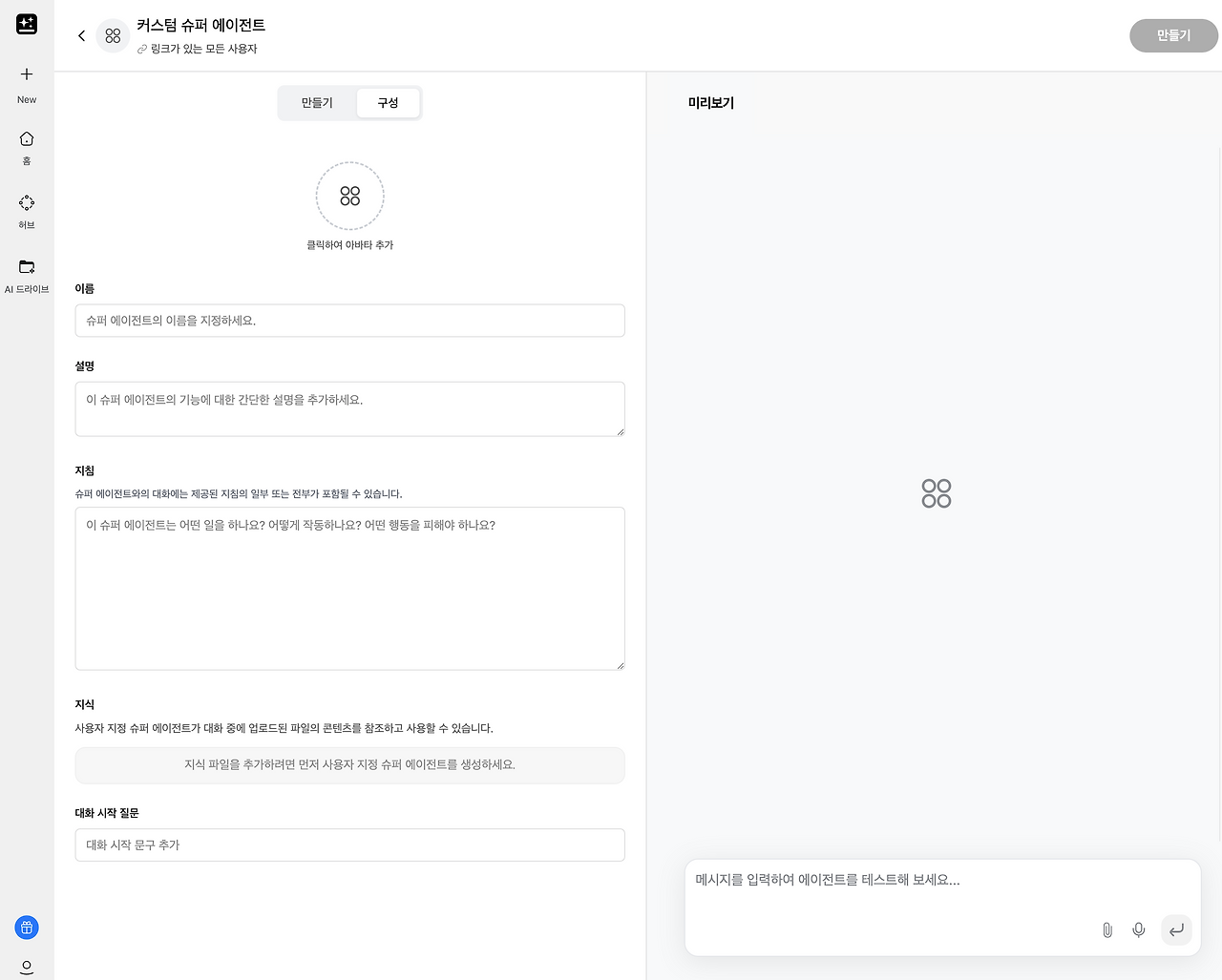 참고로 챗GPT의 GPTs 만들기 기능과 유사하다고 보시면 됩니다.