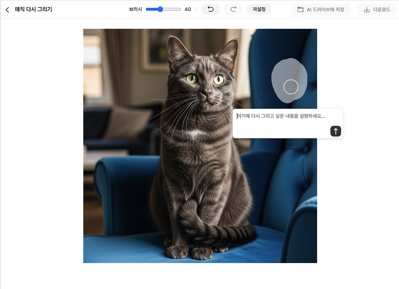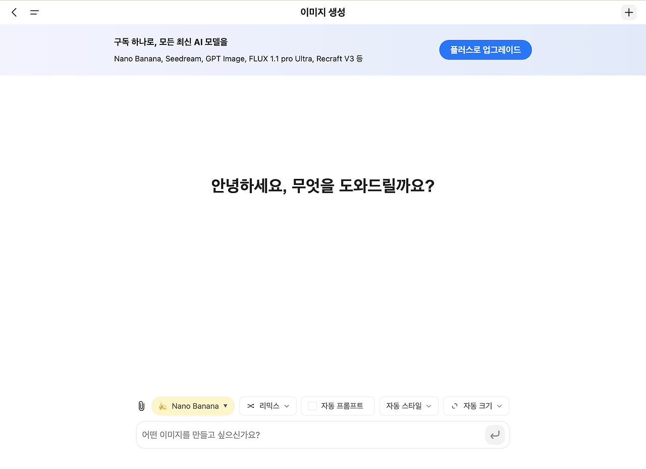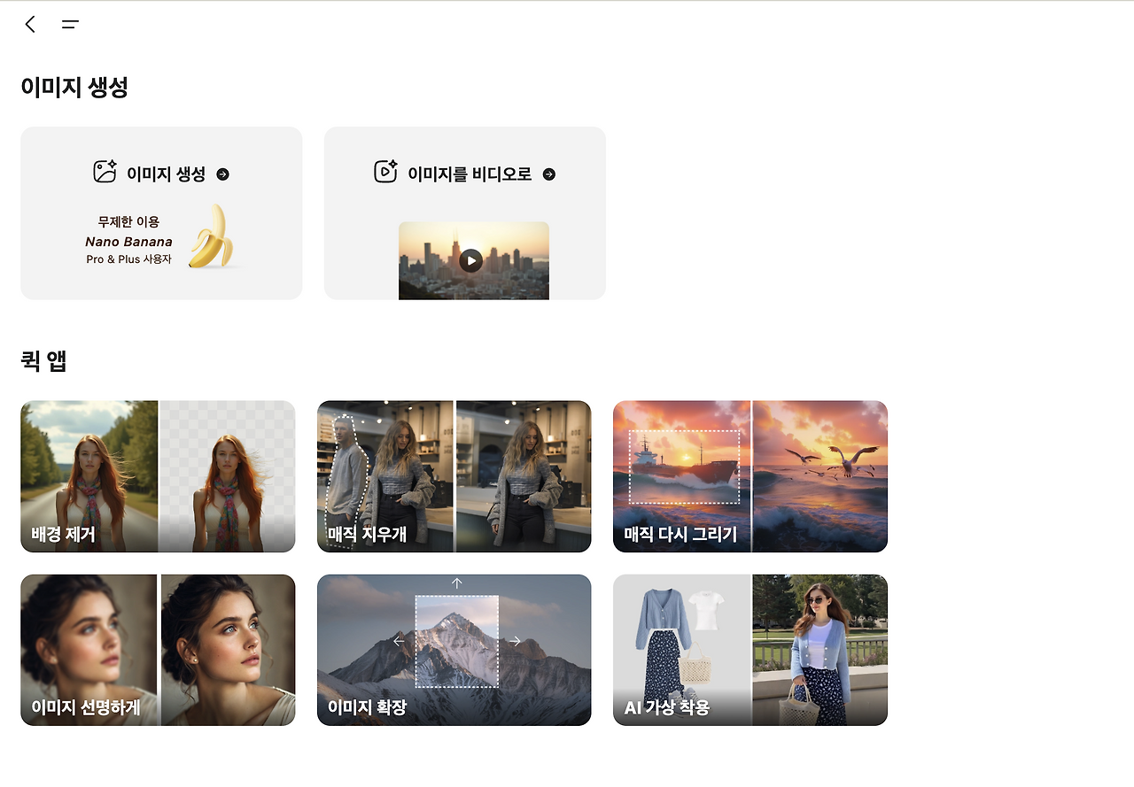 사용자가 원하는 이미지를 인공지능(AI)을 활용해 쉽게 생성할 수 있도록 제공되는 서비스입니다. 이 기능을 통해 사용자는 텍스트로 원하는 이미지를 설명하면, AI가 이를 해석해 고화질의 이미지를 자동으로 만들어줍니다. 단순한 이미지 생성뿐 아니라, 생성된 이미지를 바로 편집해 배경을 제거하거나, 특정 부분을 지우고 다시 그리거나, 이미지의 품질을 선명하게 향상시키는 등 다양한 AI 기반 보정 도구도 제공합니다.