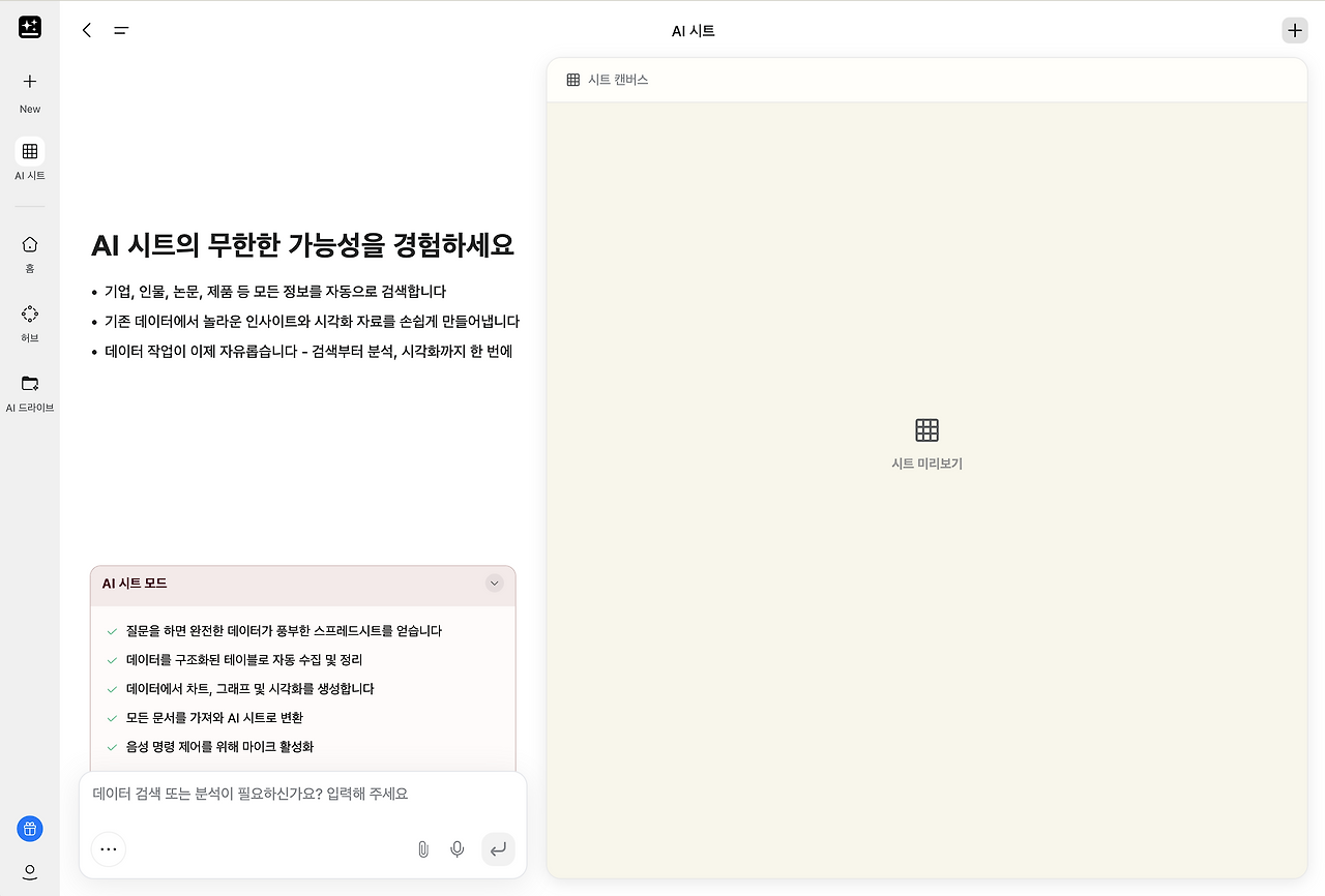 이 메뉴는 데이터의 집계, 분석, 시각화를 AI가 알아서 처리해주는 스마트 스프레드시트 도구입니다. 복잡한 함수, 차트, 데이터 통합 등을 별도 학습 없이 쉽게 구현할 수 있어서 초보자도 전문가 수준의 데이터 관리를 경험할 수 있습니다.