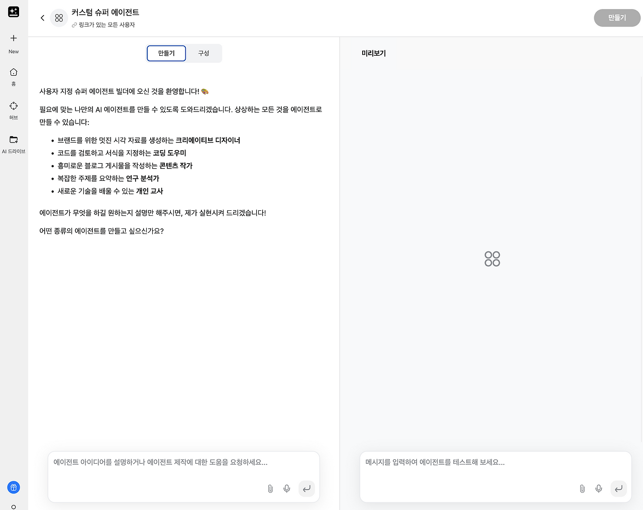 커스텀 슈퍼 에이전트는 사용자가 원하는 목적과 성격에 맞춘 맞춤형 AI 비서를 직접 만드는 기능입니다. 단순히 프롬프트를 저장하는 수준이 아니라, 말투·전문성·역할·작업 절차까지 세밀하게 설정해 두면 특정 분야의 전용 비서처럼 활용할 수 있습니다.