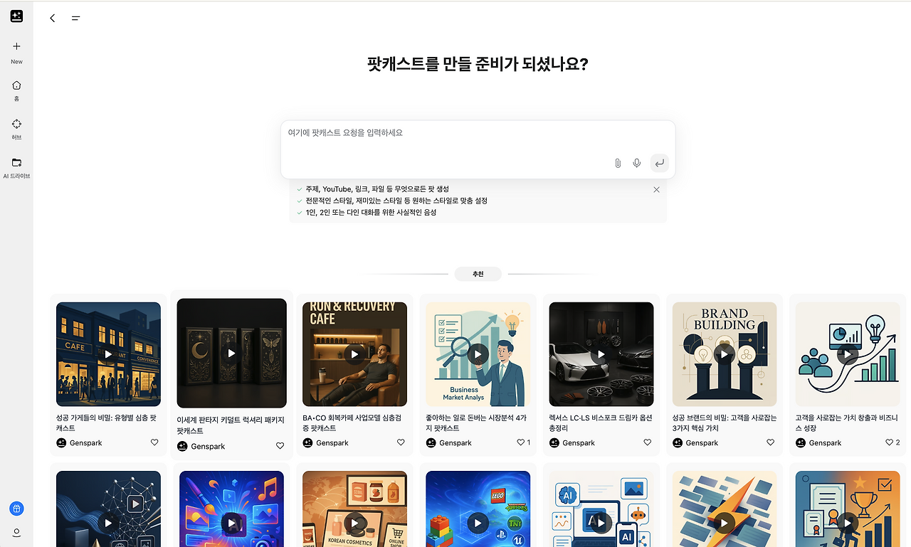 AI 팟캐스트는 사용자가 텍스트 자료나 원하는 주제를 입력하면, 자동으로 리서치, 요약, 원고 작성부터 고품질 오디오 제작까지 한 번에 처리해주는 기능입니다. 방송 전문가 없이도 뉴스, 논문, 관심사 등 다양한 내용을 실제 팟캐스트 형태의 음성 콘텐츠로 만들 수 있으며, 프롬프트 한 줄만 입력해도 정보 수집과 팩트체크, 자연스러운 진행까지 완성되는 자동화된 시스템이 특징입니다. 이를 통해 누구나 쉽게 전문가 수준의 팟캐스트 제작이 가능하며, 다양한 시나리오와 콘텐츠 확장성이 뛰어납니다.