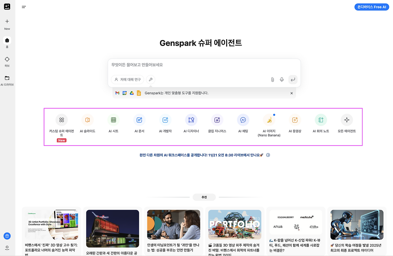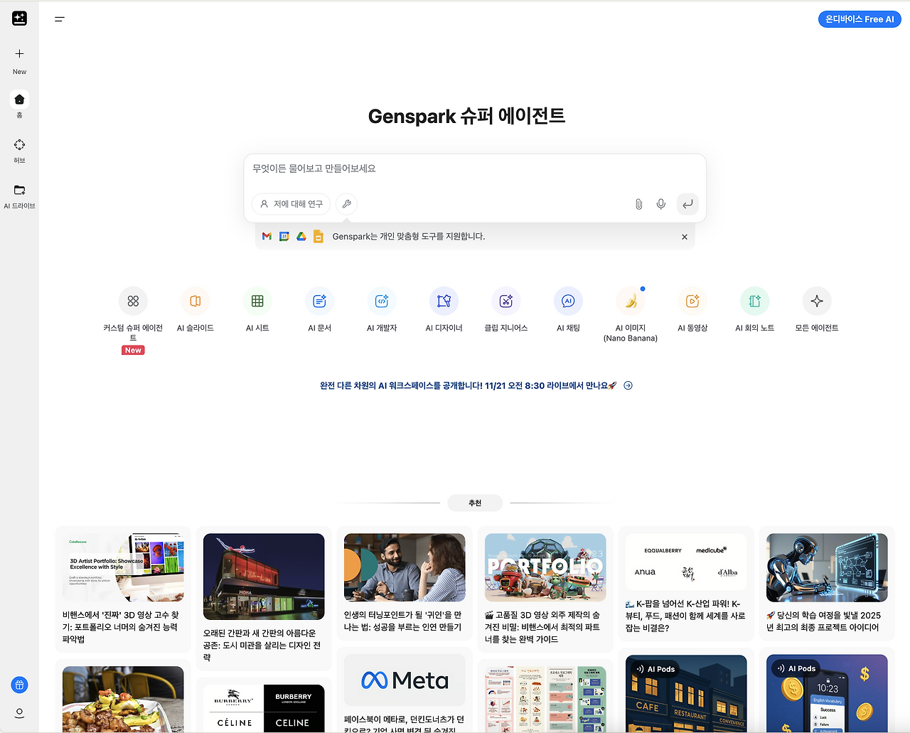 젠스파크(Genspark)는 개별 기능에 흩어져 있던 AI 작업들을 한곳에서 처리할 수 있도록 만들어진 통합형 생산성 플랫폼입니다. 문서·슬라이드·데이터 분석·이미지·영상·개발·연구·팩트 체크 등 다양한 업무 흐름을 AI가 처음부터 끝까지 자동화해 주는 것이 특징입니다.