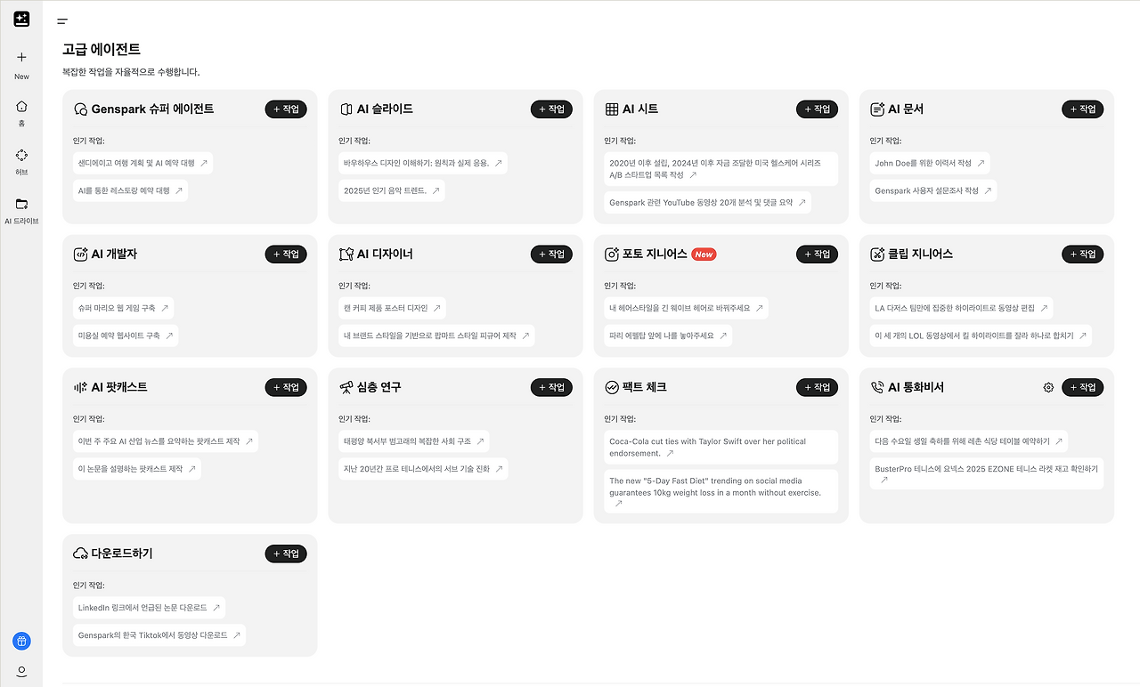 AI 도구가 많아도 정작 실무에 바로 적용하기 어려웠던 이유는, 기능이 분리되어 있어 흐름이 끊기기 때문입니다. 젠스파크는 이 문제를 해결해 하나의 플랫폼 안에서 기획, 제작, 분석, 검증까지 이어지는 효율적인 환경을 제공합니다. 아래에서는 15개의 AI 기능이 실제로 어떤 작업을 얼마나 강력하게 지원하는지 정리했습니다.