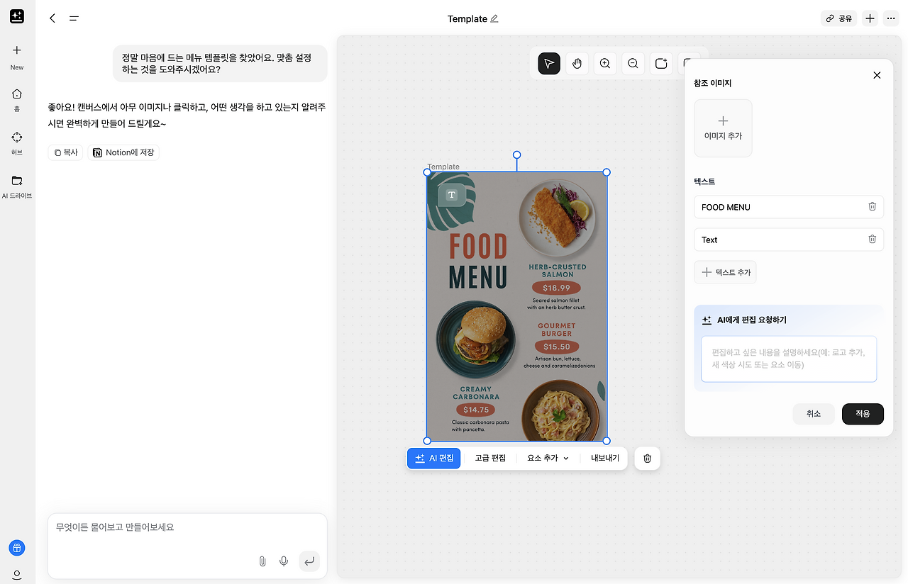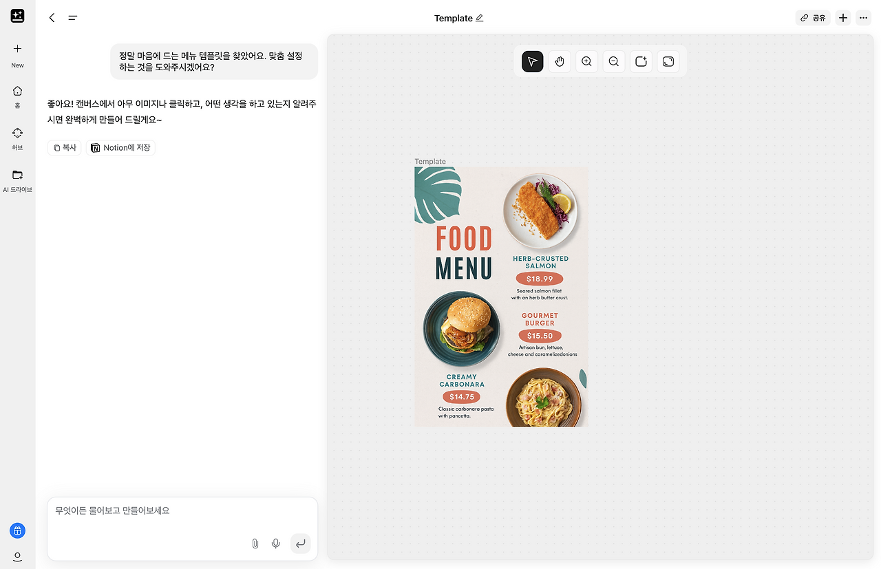 예시로, ‘연말 크리스마스 포스터’ 주문 시 행사 성격에 맞는 아이콘·배색·타이포그래피까지 포함한 디자인을 AI가 빠르게 생성해줍니다. 이후 수정이나 변형도 자유롭습니다.