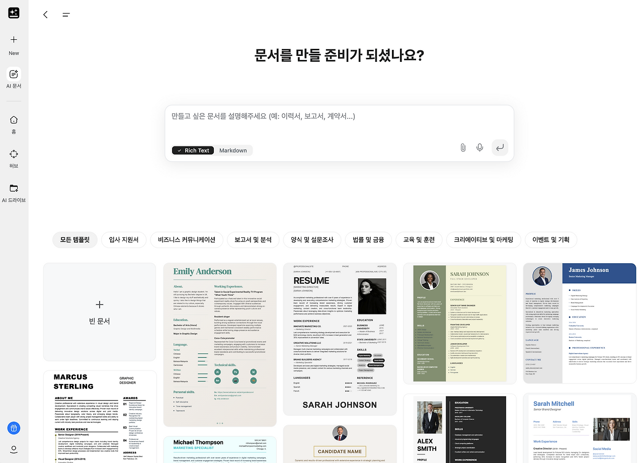 보고서, 기사, 블로그 등 다양한 유형의 문서를 신속하게 작성·편집해주는 AI 자동화 도구입니다. 텍스트 초안만 입력하면 AI가 구조화와 통계 데이터, 그래픽 요소, 트렌드 분석까지 문서에 포함시켜 완성도 높은 결과물을 제공합니다.