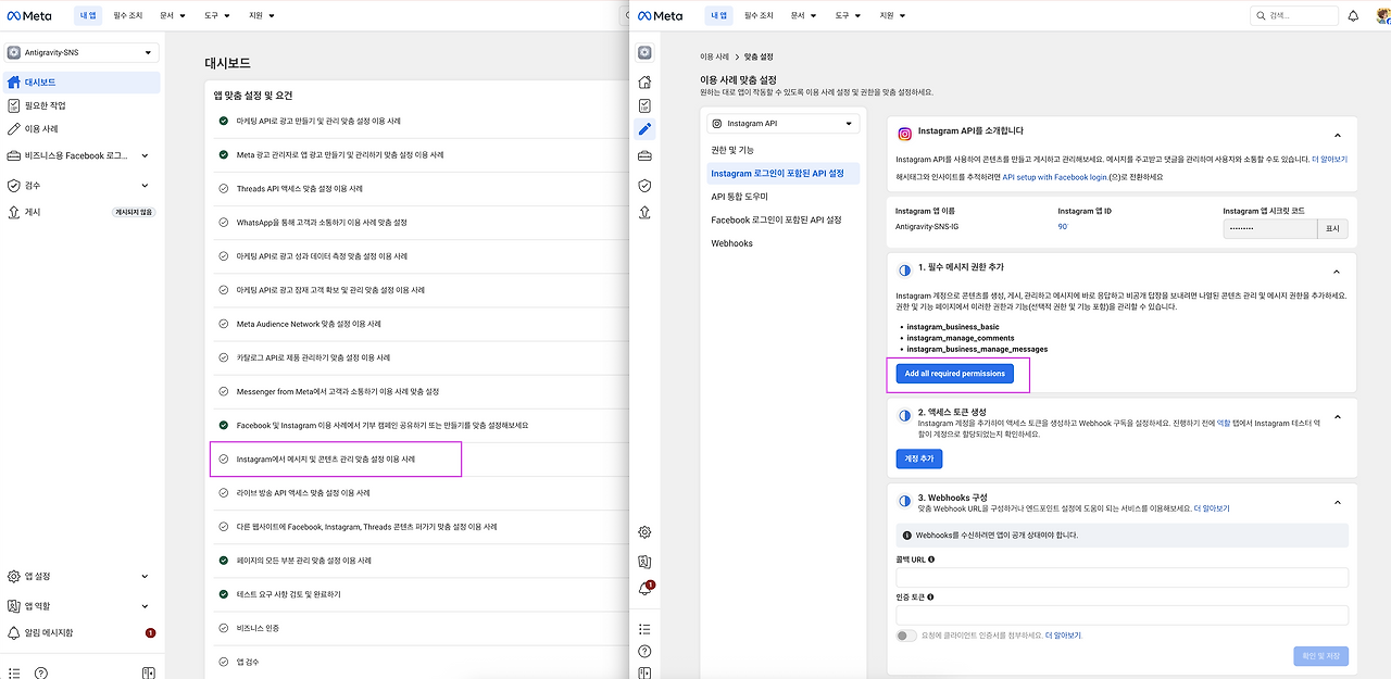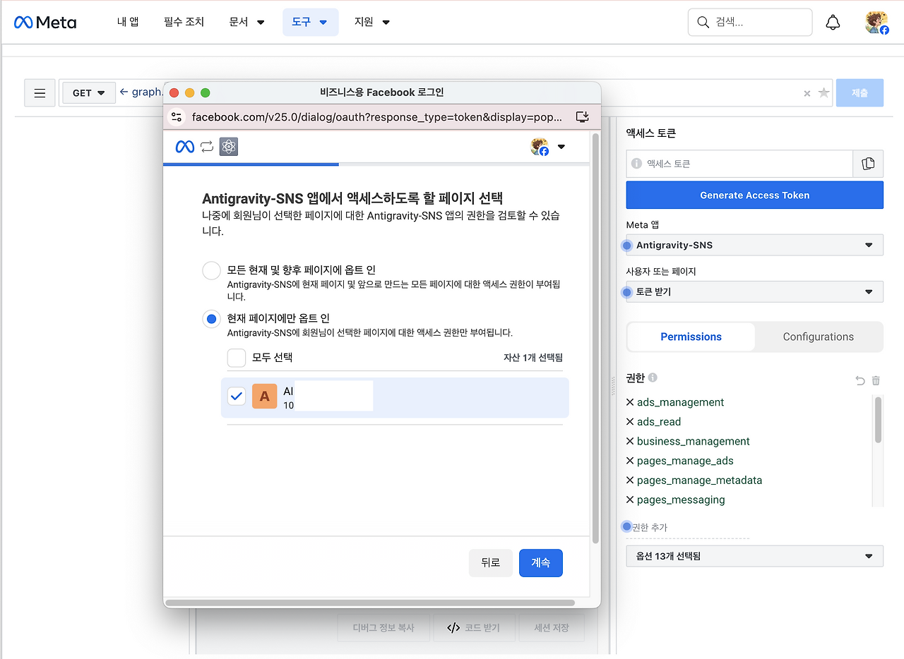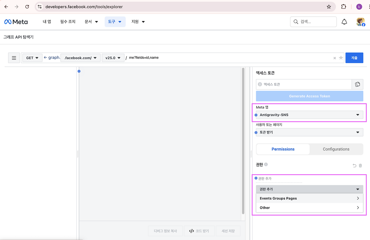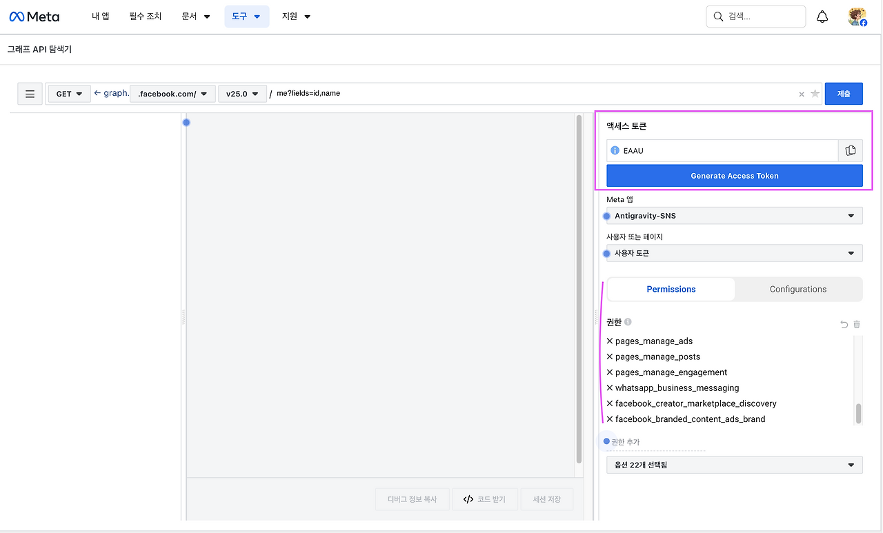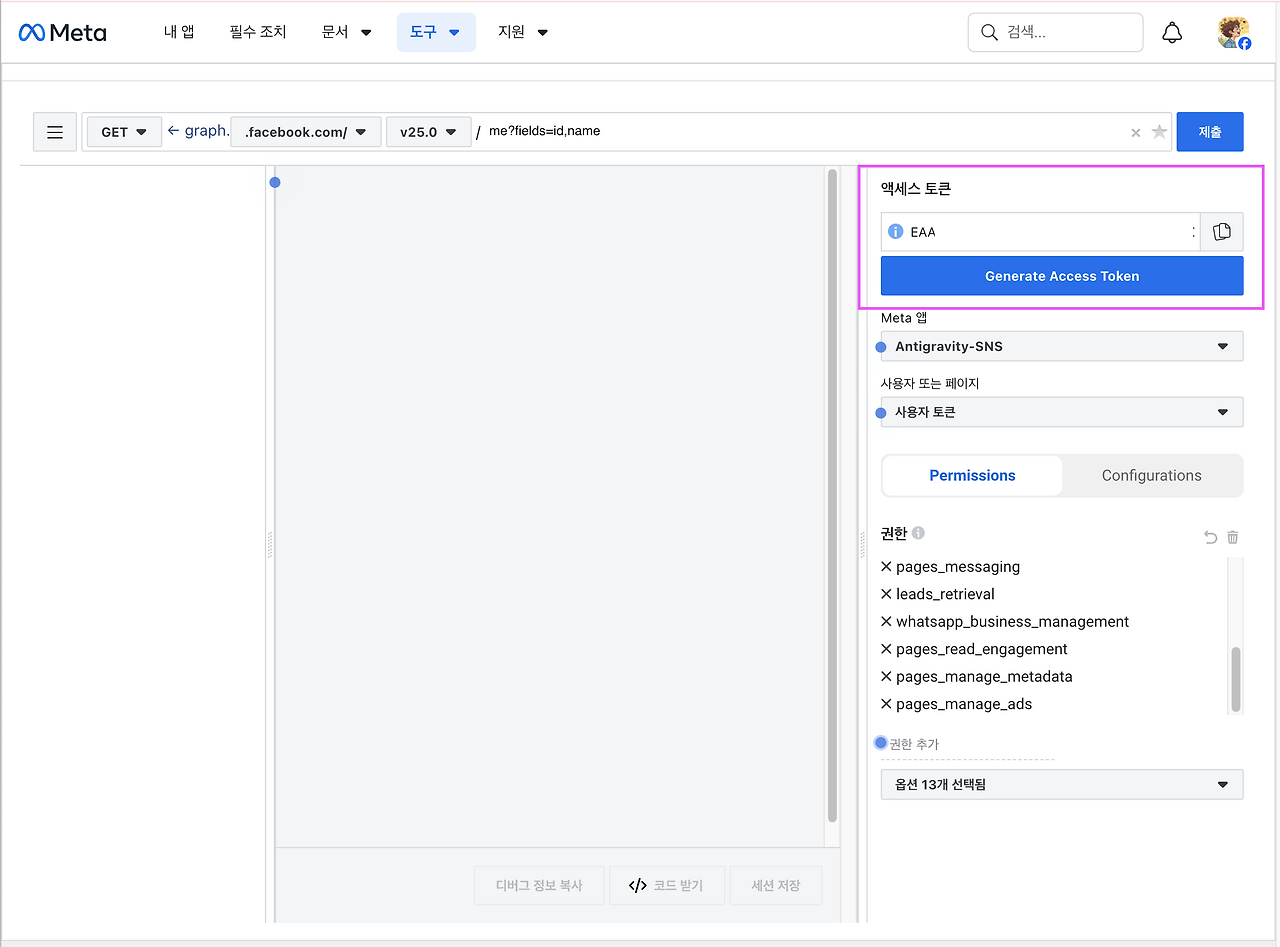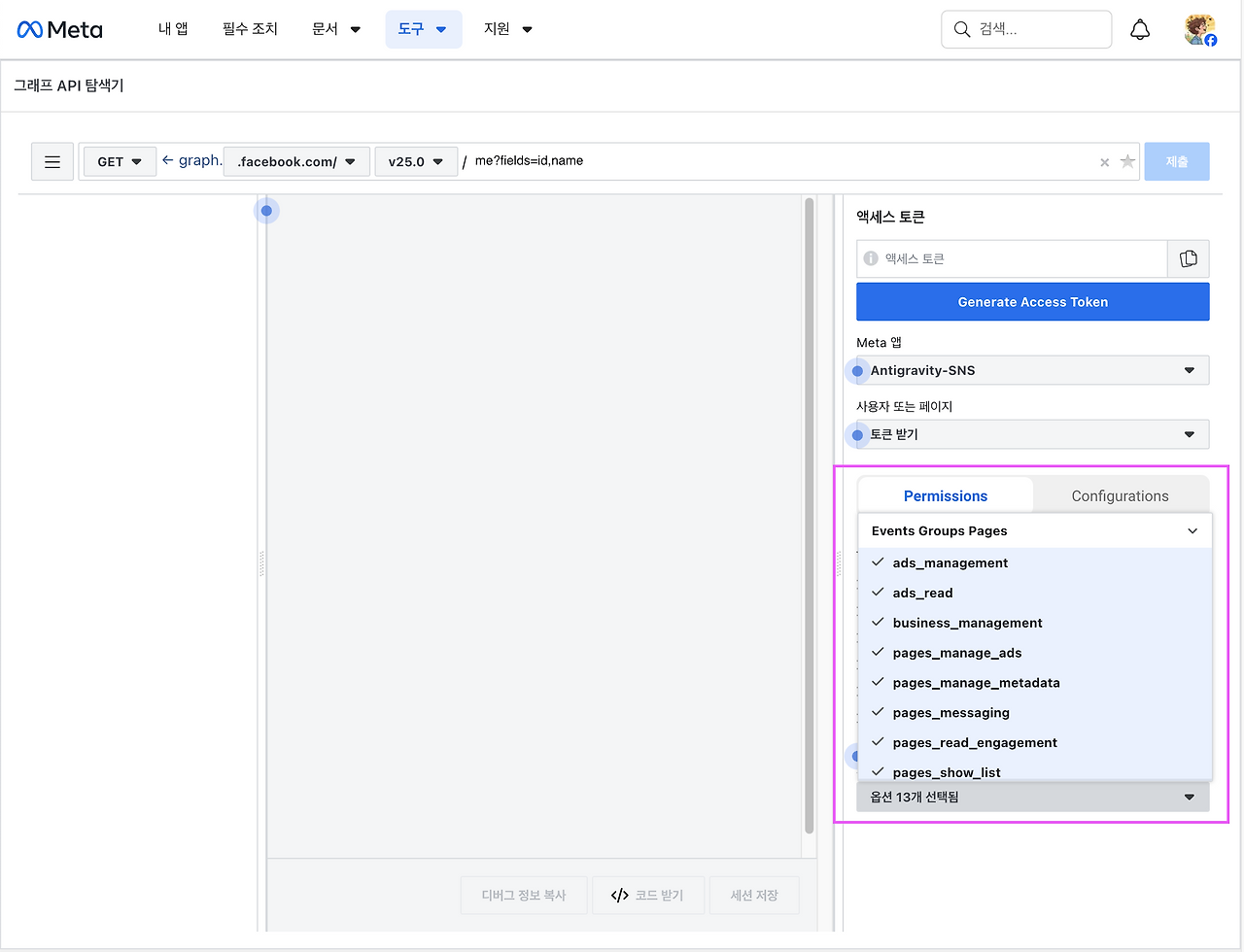 오른쪽 상단의 앱 선택 영역에서, 앞에서 생성한 Meta 앱(예: Antigravity-SNS)을 선택합니다.