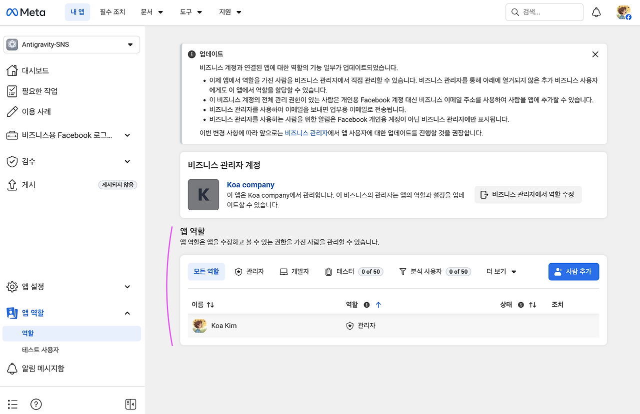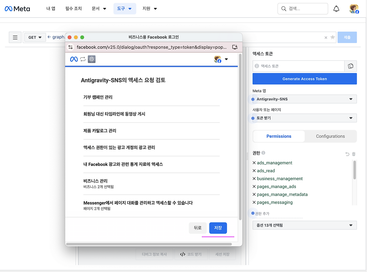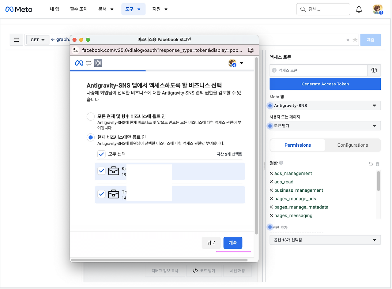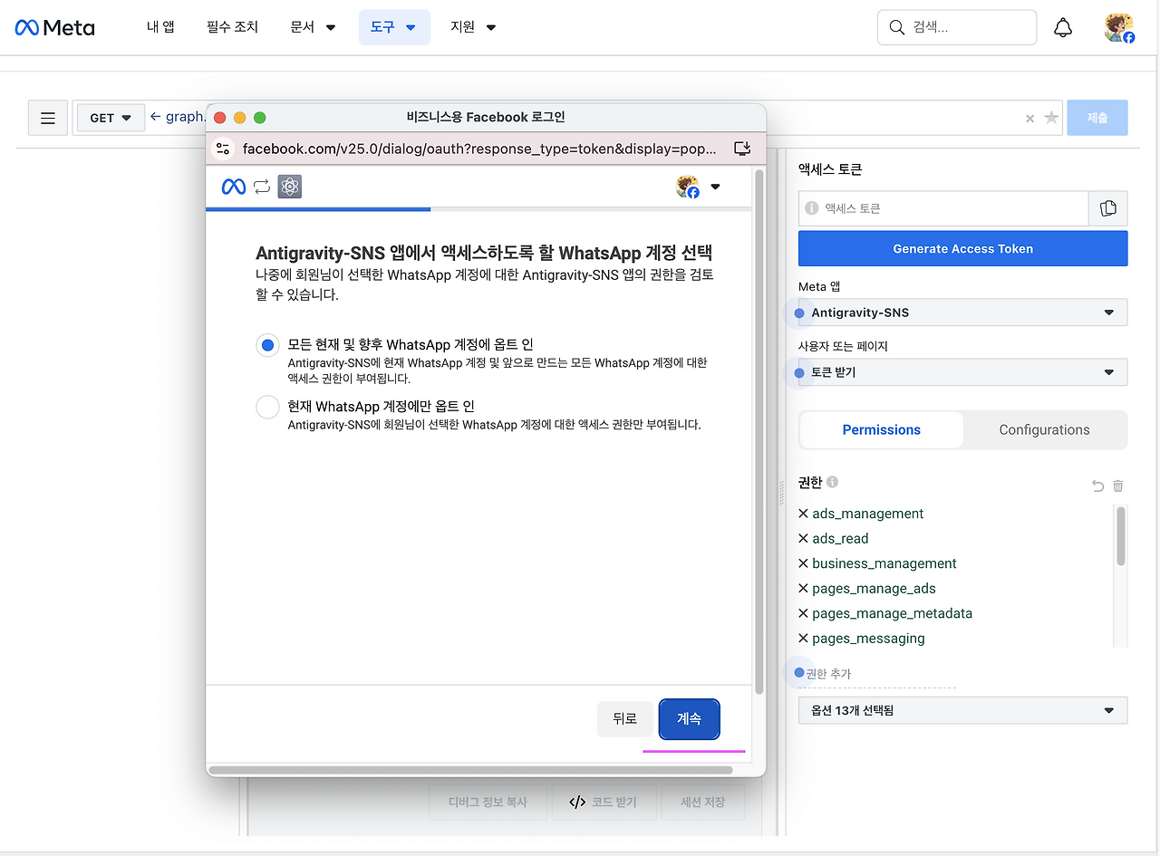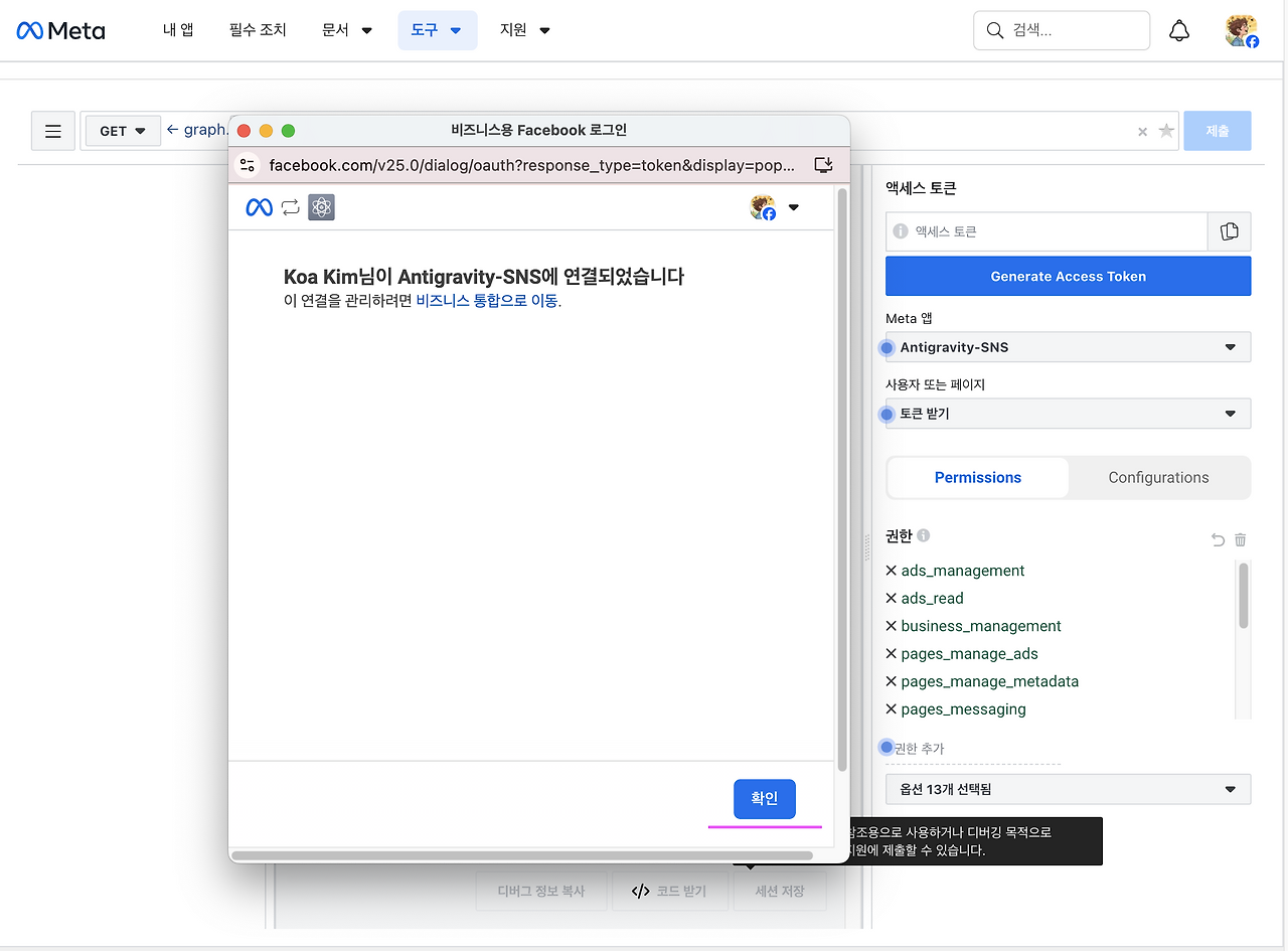오른쪽 상단의 앱 선택 영역에서, 앞에서 생성한 Meta 앱(예: Antigravity-SNS)을 선택합니다.