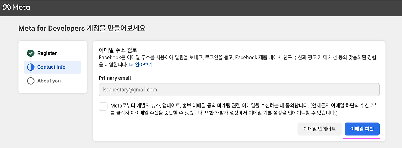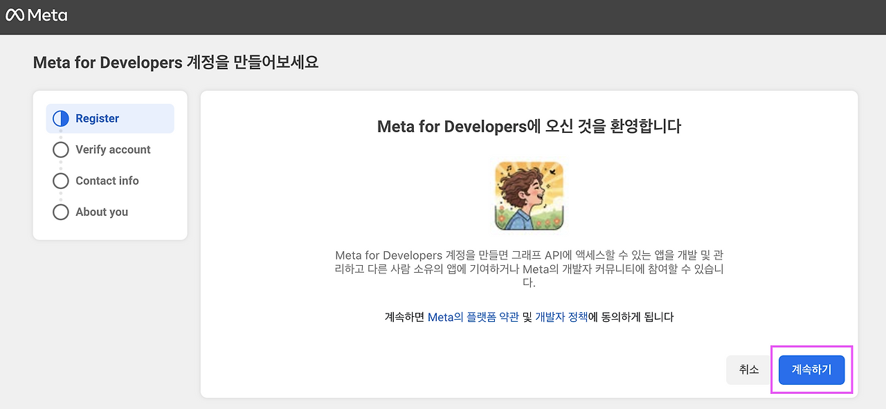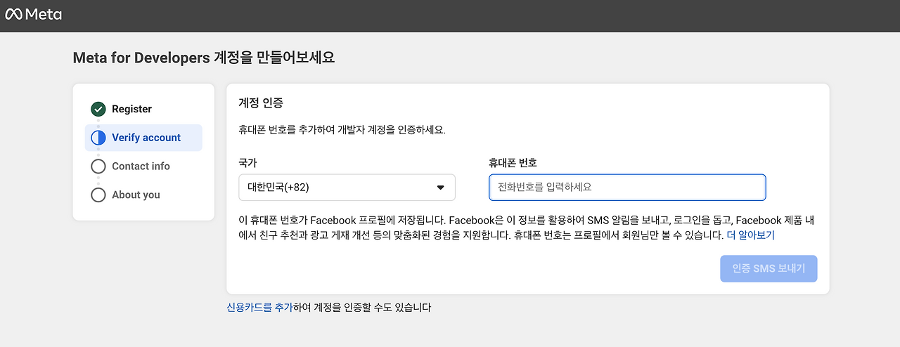 여기에서 결제수단 등록을 완료한 후, 다시 Meta for Developers의 ‘Verify account’ 화면으로 돌아가 새로고침하면 다음 단계 화면으로 자동 이동합니다.