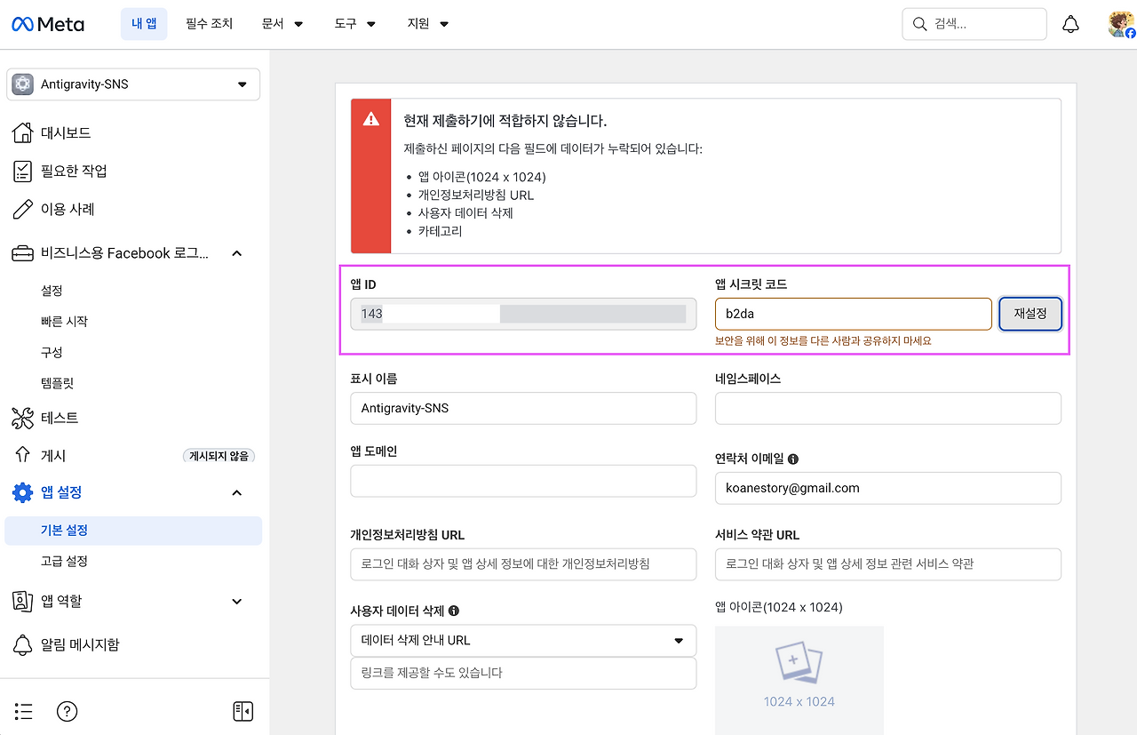 이 값들은 이후 Antigravity에서 Facebook과 연동을 설정할 때 꼭 필요한 정보이니, 잃어버리지 않도록 잘 보관해 주세요. 그리고 절대로 다른 사람에게 공유하지 마세요.