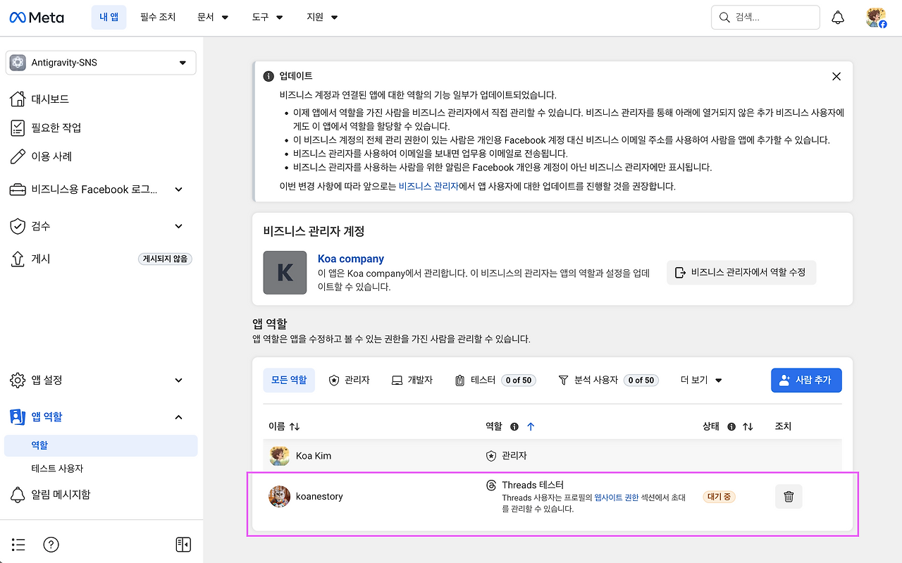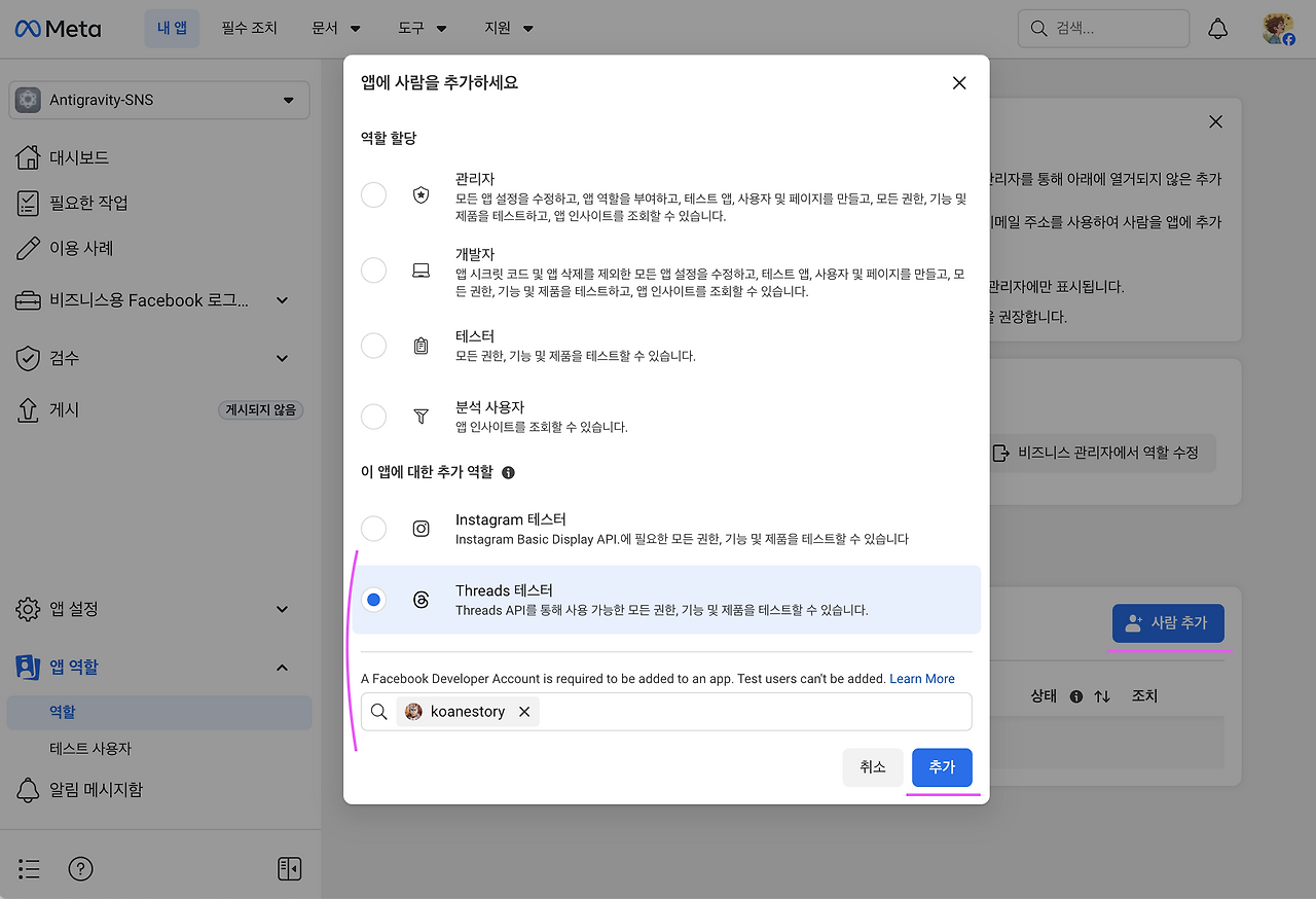 [사람 추가] → 「이 앱에 대한 추가 역할 → Threads 테스터」를 선택한 뒤, 본인의 Threads 사용자 이름(ID)을 입력합니다. (예: @antigravity_test에서 @를 제외한 아이디만 입력)